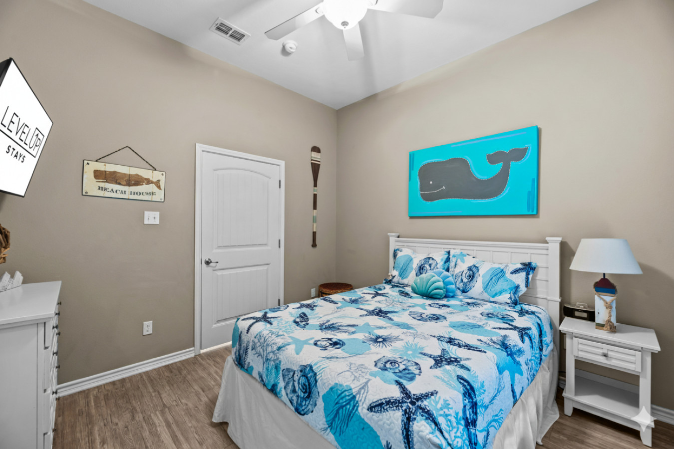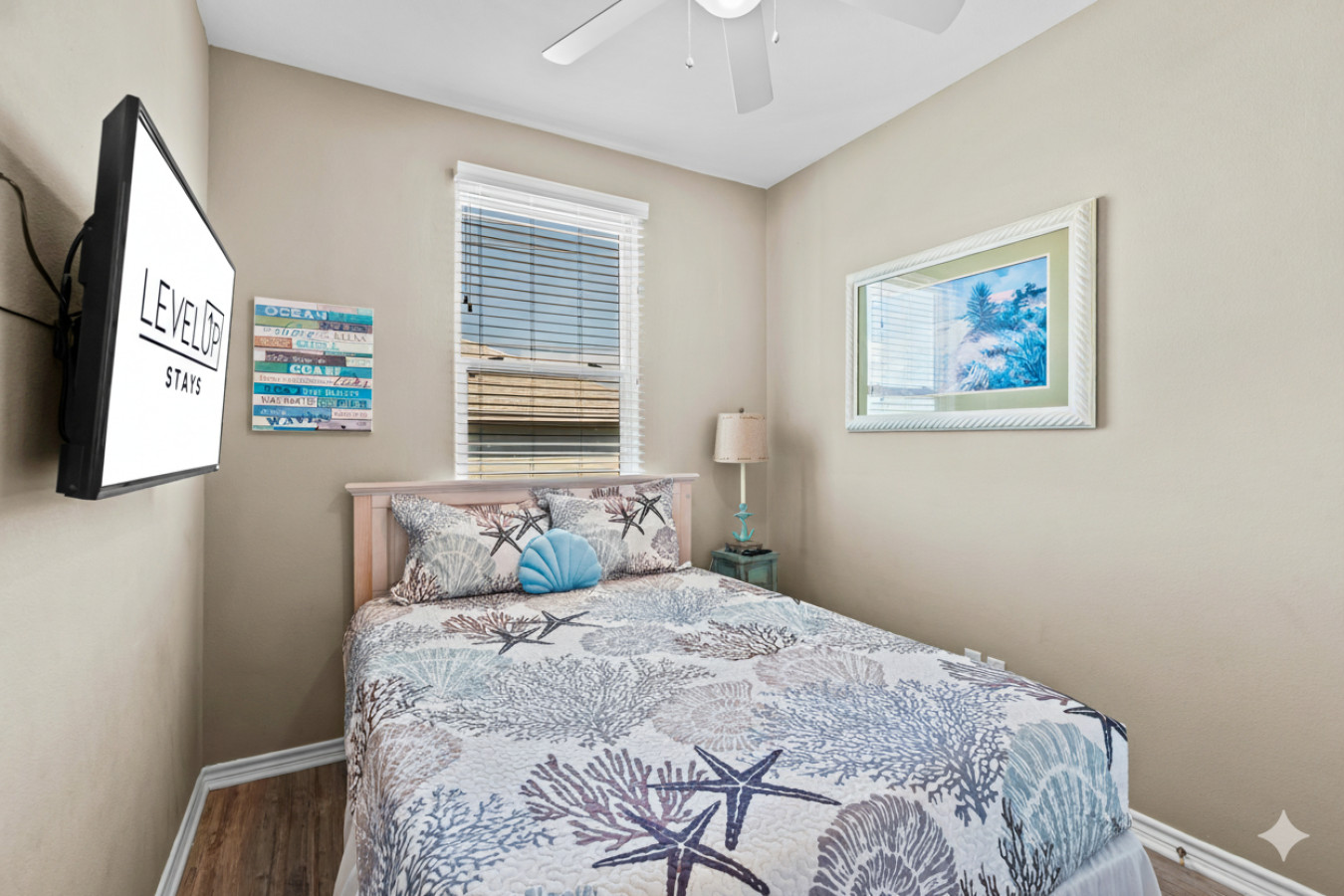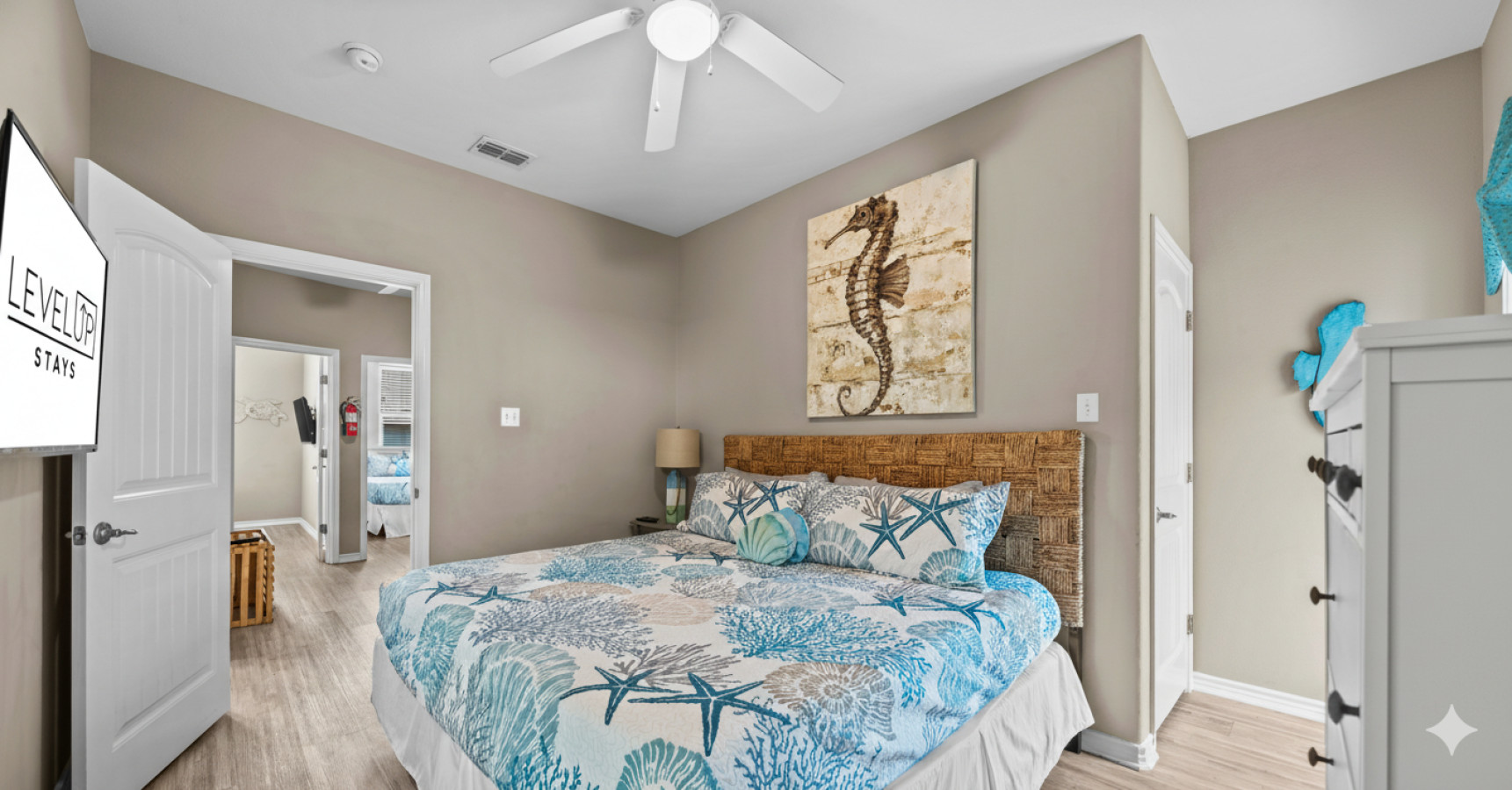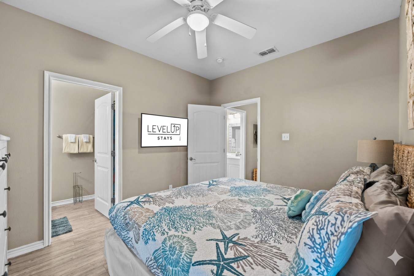 The main level offers a queen bedroom with a smart TV, ideal for guests preferring easy access. Upstairs, a relaxed loft with a sofa and TV sits between three serene queen bedrooms, including a master suite. Each room is designed with relaxation in mind, dressed in soft hues and seaside accents that echo the rhythm of the waves. With plenty of space and amenities, you’ll have everything you need to unwind, reconnect, and make lasting memories.