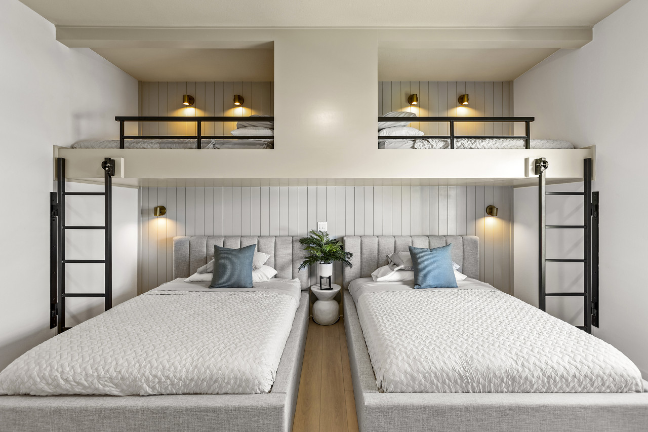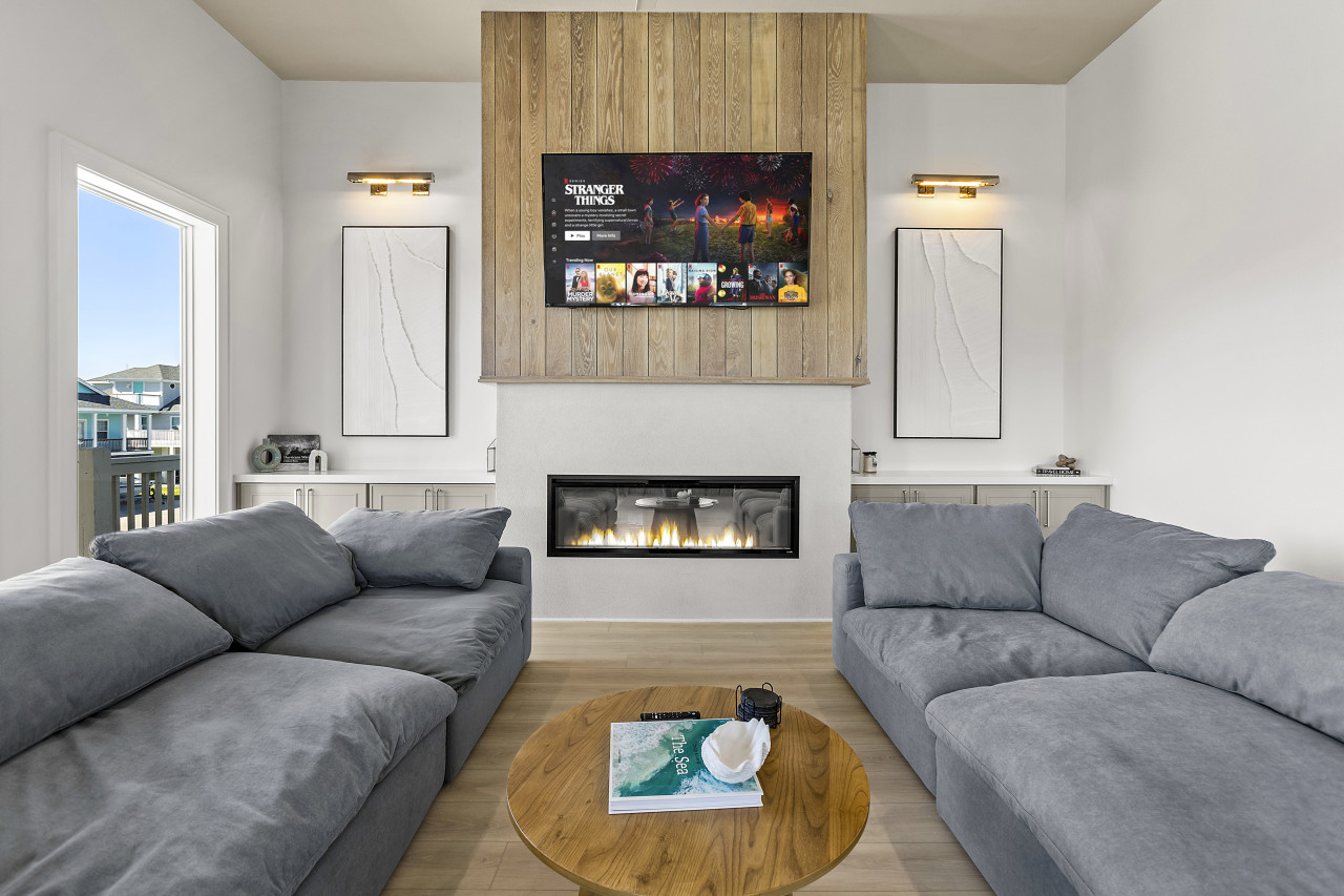 Indulge in the convenience of our fully stocked kitchen, complete with a wine cellar for those special occasions. Gather in the open concept living room, furnished with large couches, a cozy fireplace, and a 70" smart TV, perfect for family bonding and entertainment. With comfortable sleeping arrangements including luxurious king and queen-sized beds, as well as two twin-sized bunk beds with attached bathrooms, everyone will find their perfect spot to unwind.