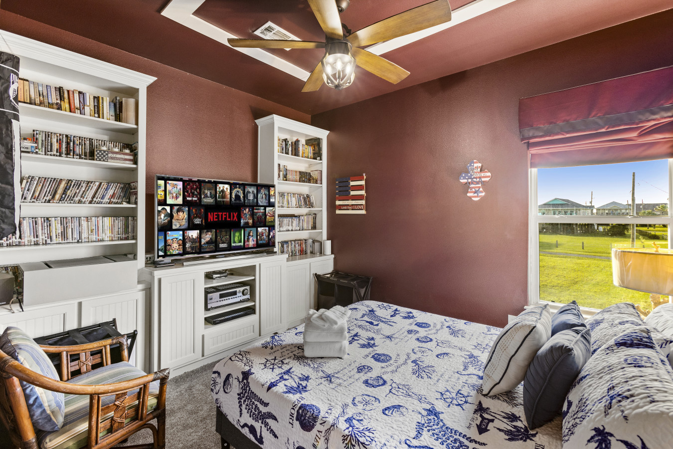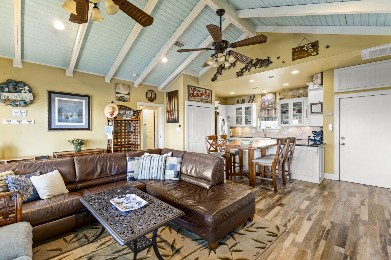Inside, the fully stocked kitchen includes everything you need to cook meals at home, plus a coffee station with a drip coffee maker to start your mornings right. The living room and two bedrooms are equipped with smart TVs, perfect for movie nights or quiet downtime. One bedroom features an entire DVD library for a fun movie night after the beach!