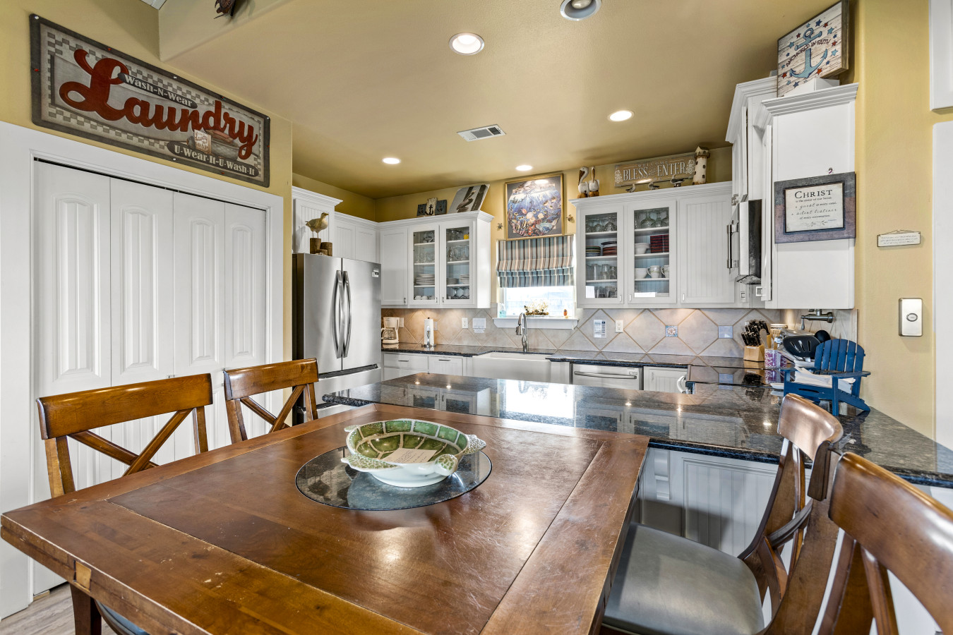 Gather around for board games after dinner or freshen up in the outdoor shower after a sandy beach day. A full laundry area with a stackable washer and dryer adds convenience for longer stays.
