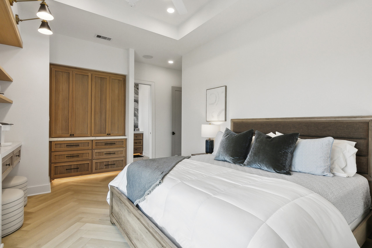 -First Bedroom (Master): King bed with an en-suite full bathroom, built in wardrobe and coffee bar with Keurig machine