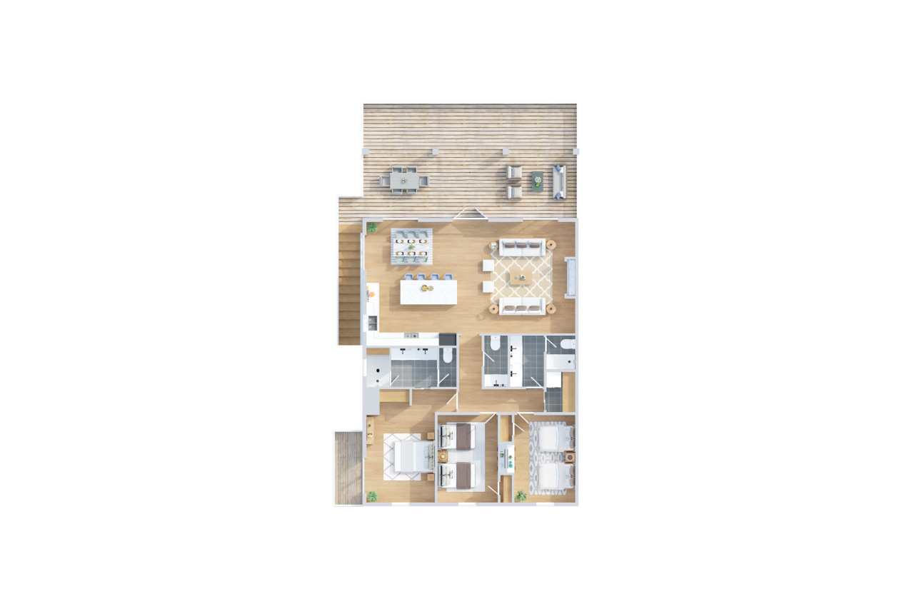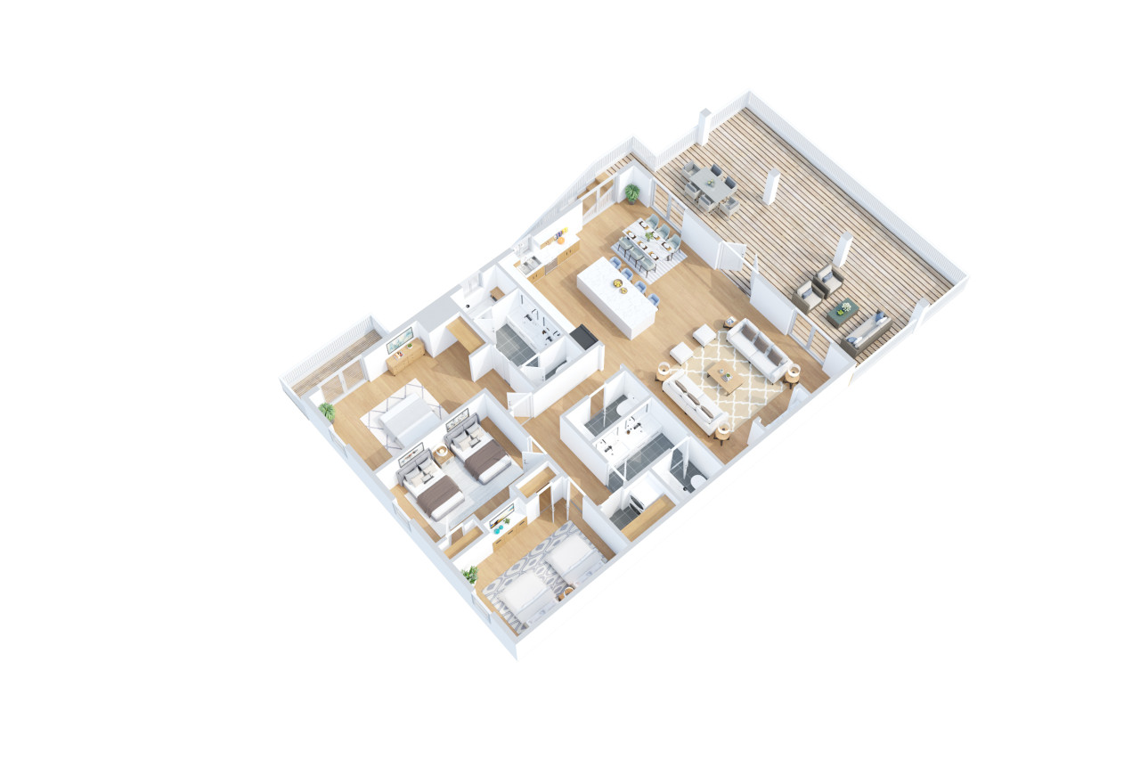 The master bedroom features a king bed with an en-suite full bathroom with a luxurious walk in shower, a built-in wardrobe, and a coffee bar with a Keurig machine, ensuring a restful stay. The second and third bedrooms each come with two queen beds and share a full bathroom, offering ample space for everyone to unwind.