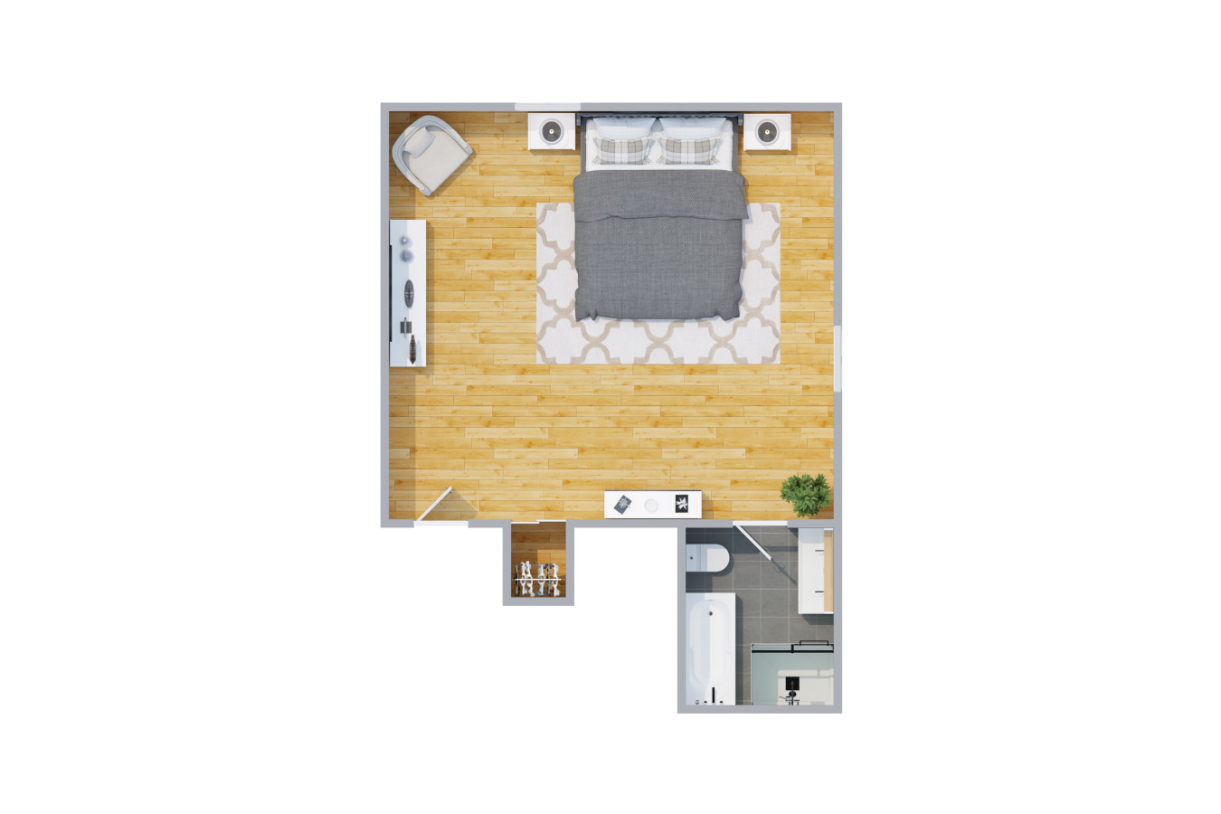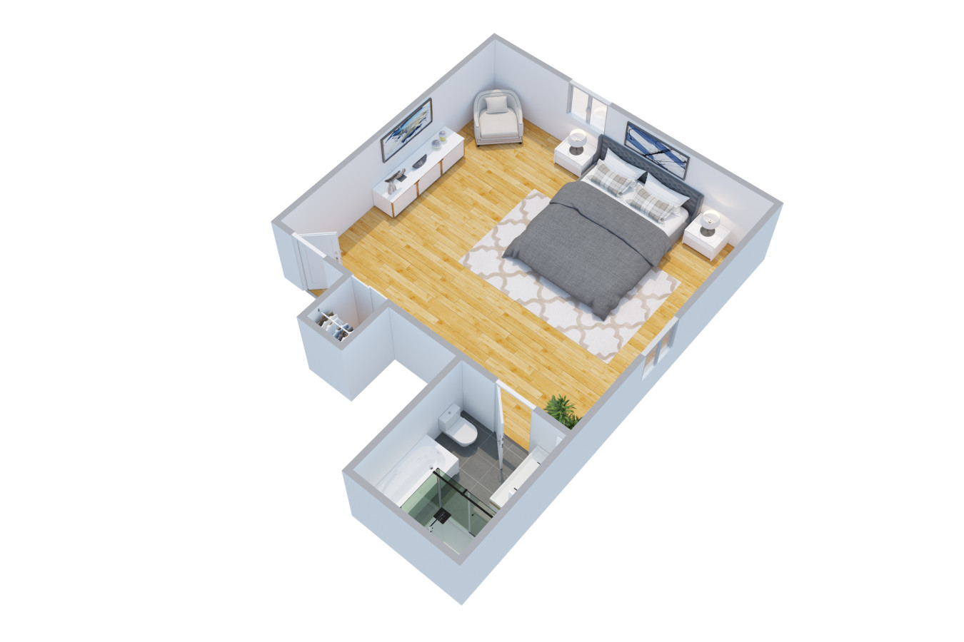 •One queen bedroom – one full bathroom with walk in shower, mini-fridge, and coffee station.