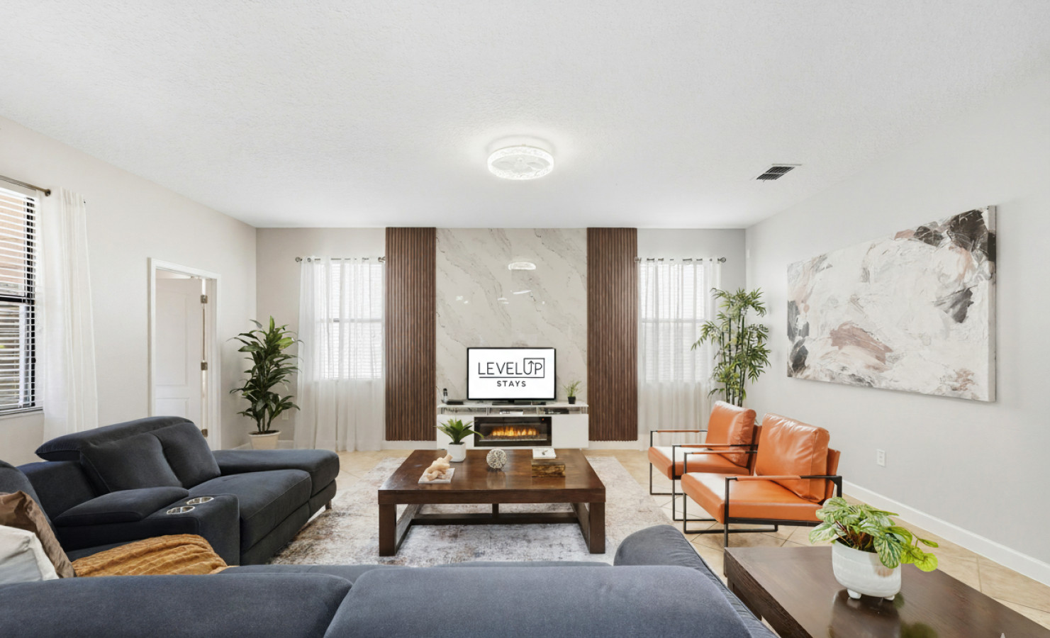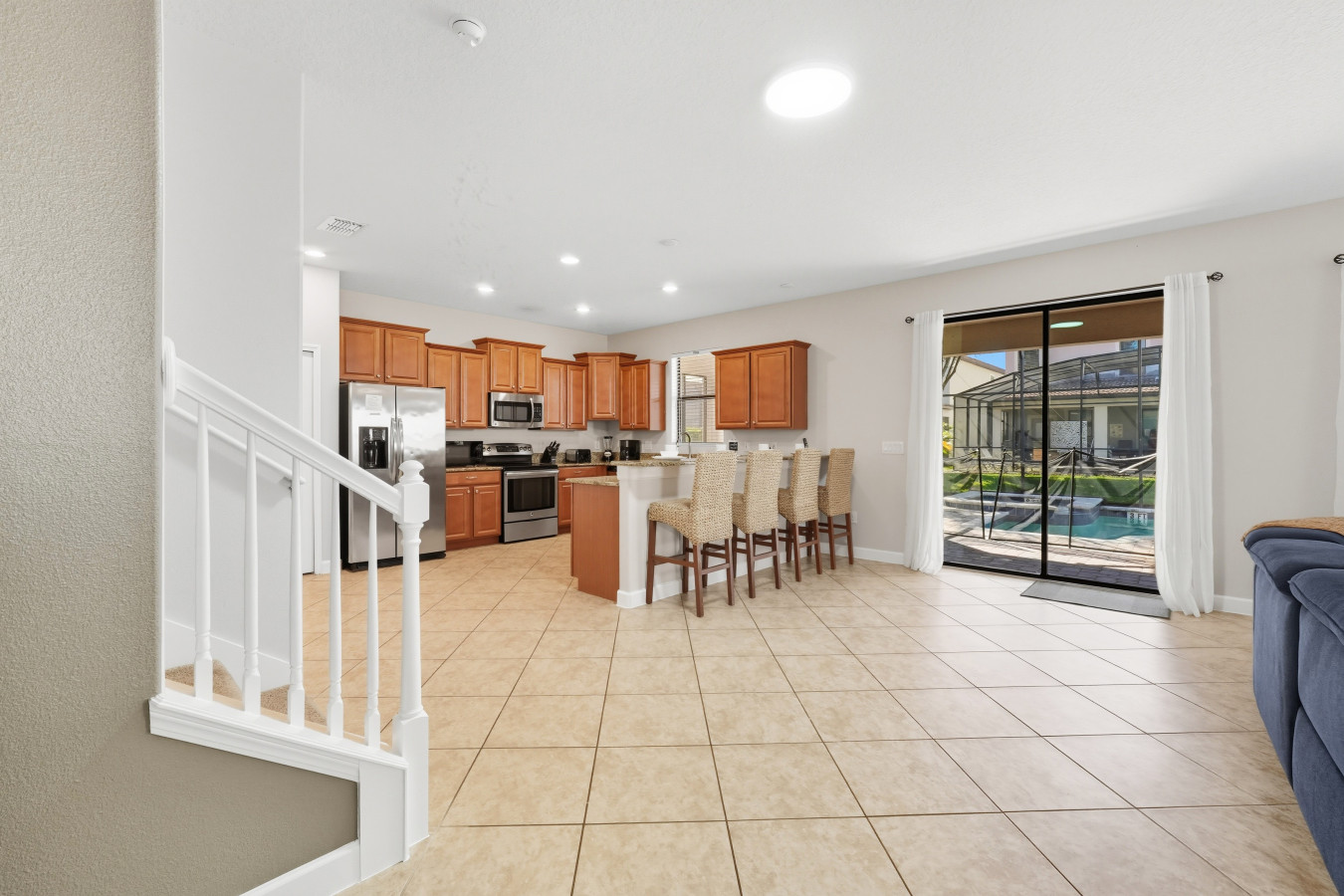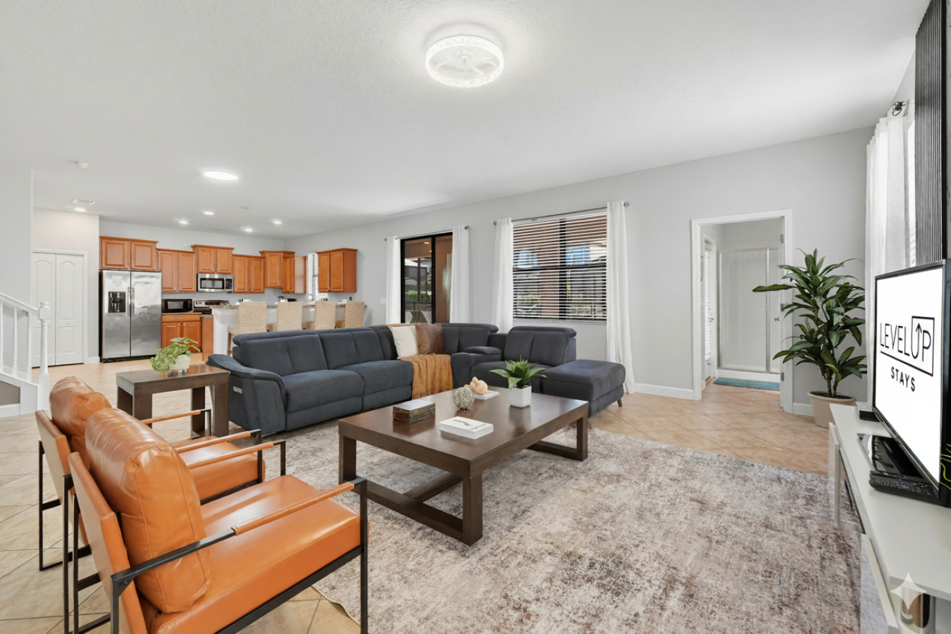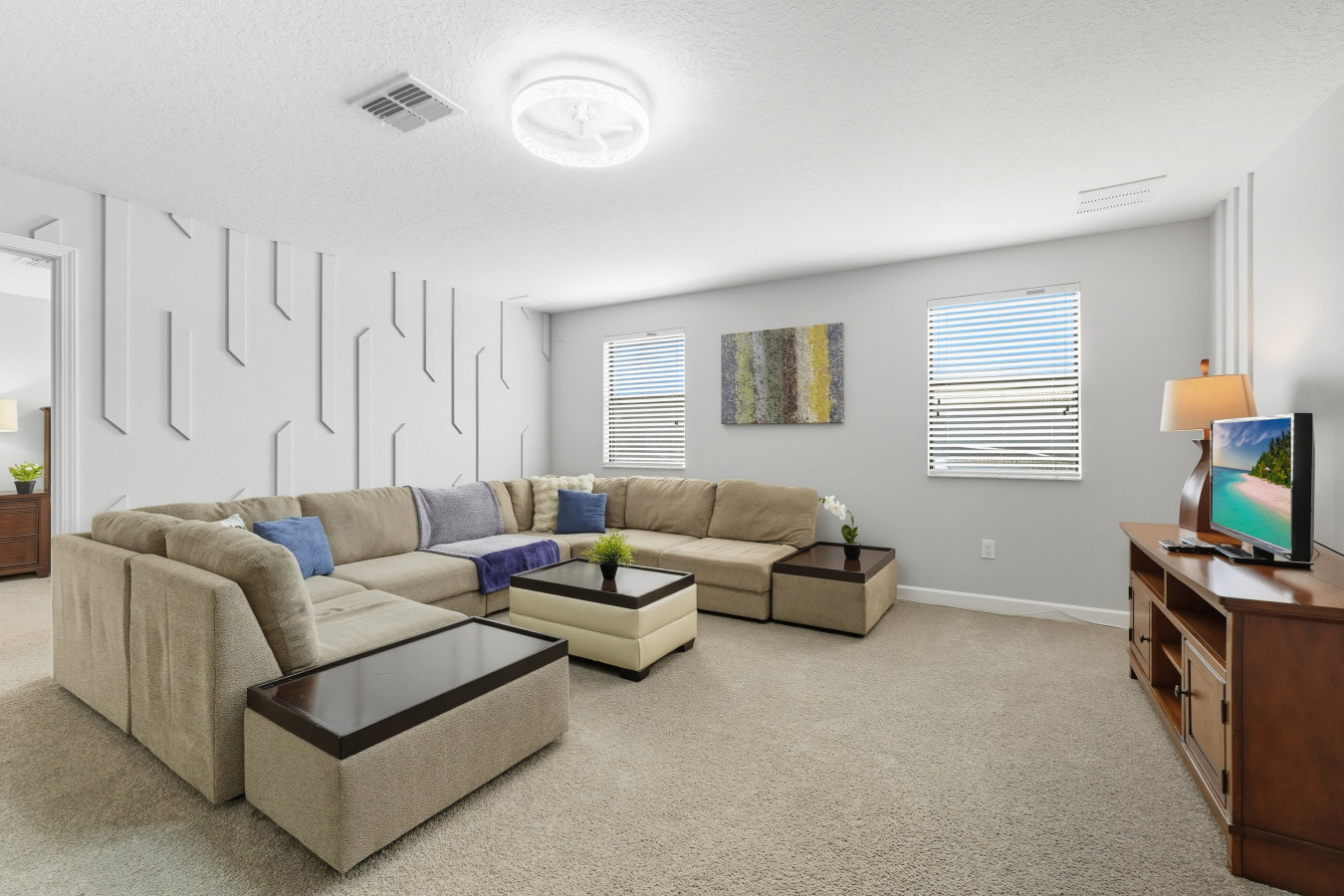From the moment you step into Moonlight Villa, you’ll feel right at home. The open-concept living space invites you to relax after a day of adventure, whether you’re gathering on the plush couches for movie night or enjoying a family meal prepared in the fully equipped kitchen. Every detail has been designed with your comfort in mind, from blackout curtains to Smart TVs in every bedroom.