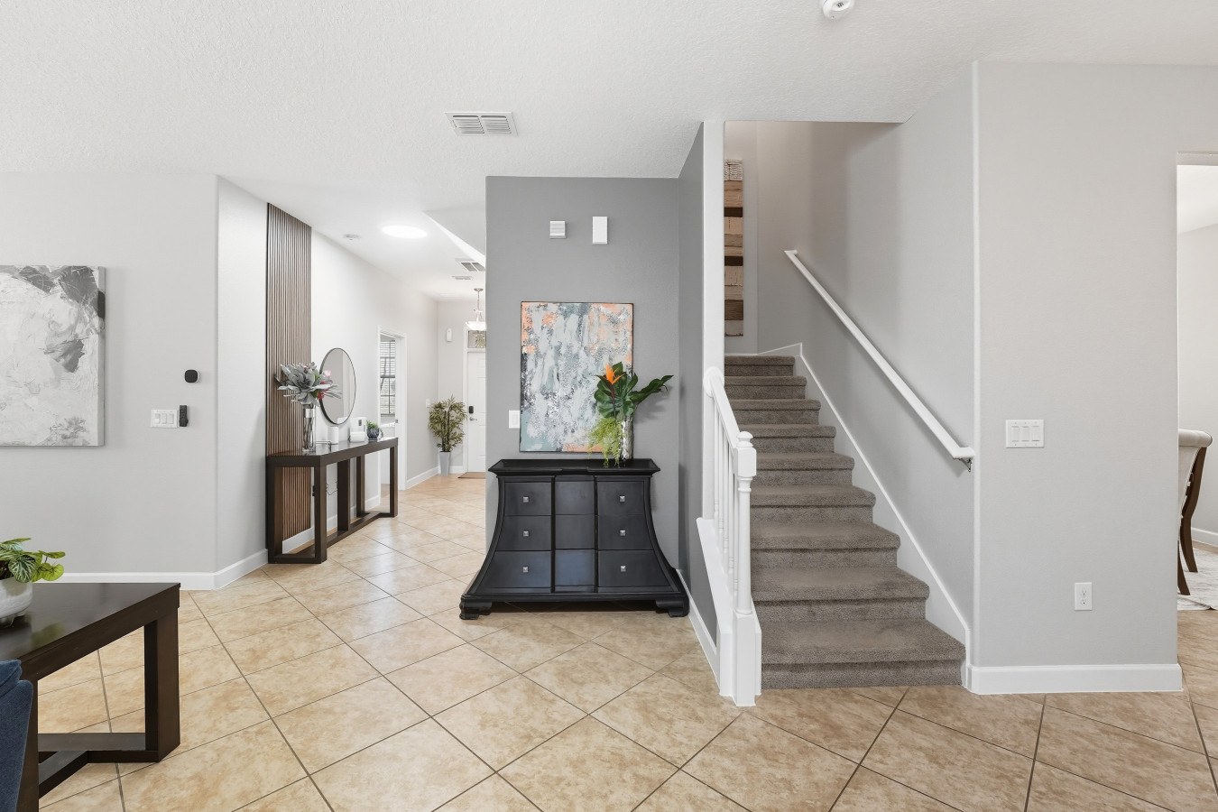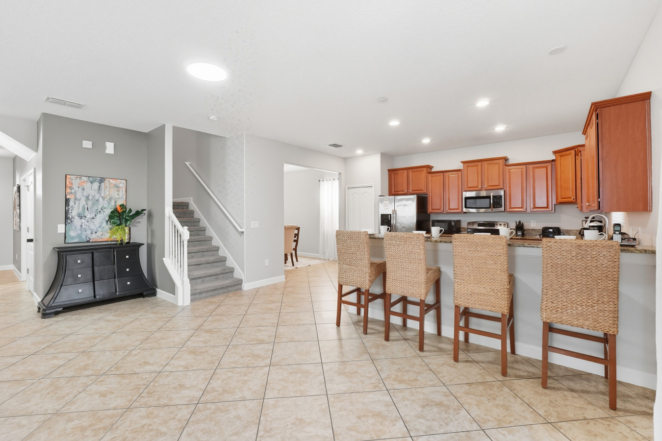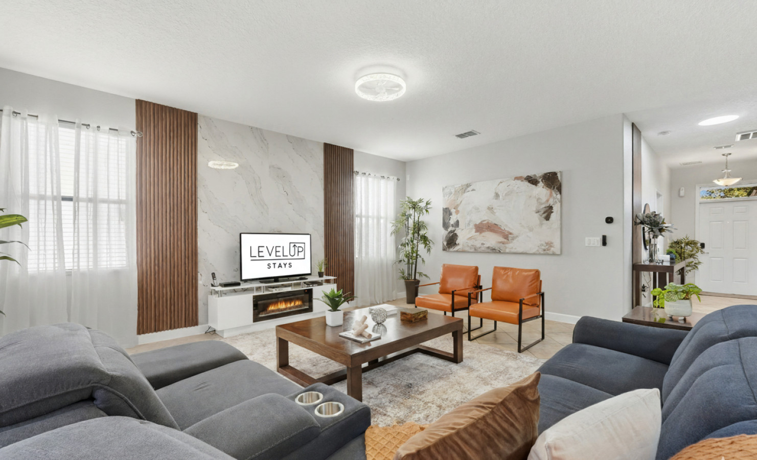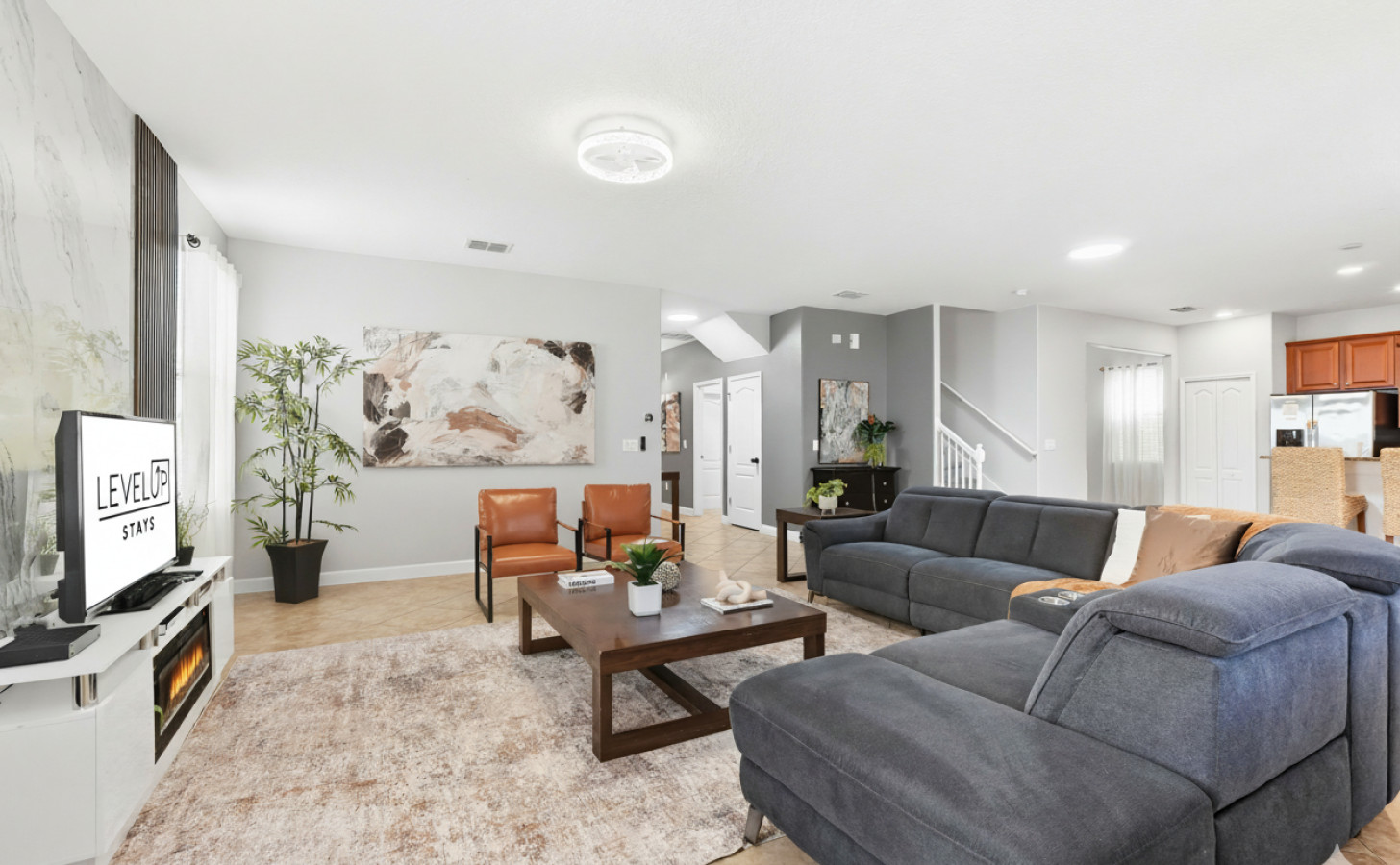 Inside, the open-concept living room is bright and inviting, complete with comfortable seating and a Smart TV for relaxing evenings. The modern kitchen is fully equipped with cookware, dinnerware, and appliances, offering everything needed to enjoy meals together. Each bedroom has been designed with guest comfort in mind, featuring plush bedding, blackout curtains, and Smart TVs for added convenience. A travel crib and high chair are also available upon request, making the home especially family friendly.