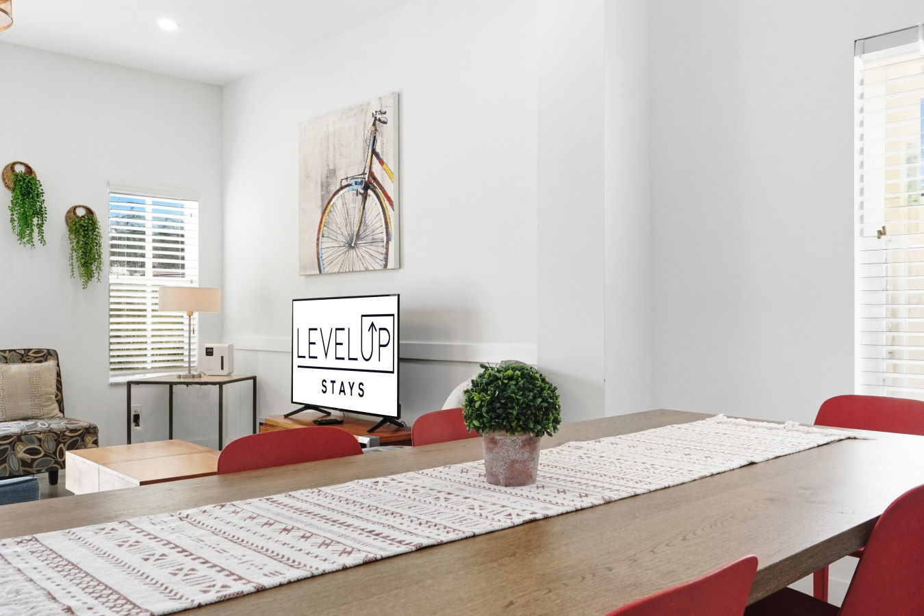 Step inside to the bright, open living and dining area, where you can gather for meals, movie nights, or just conversation. The fully equipped kitchen makes it easy to prepare anything from a quick breakfast to a homecooked dinner, while the adjoining dining table is perfect for family gatherings.