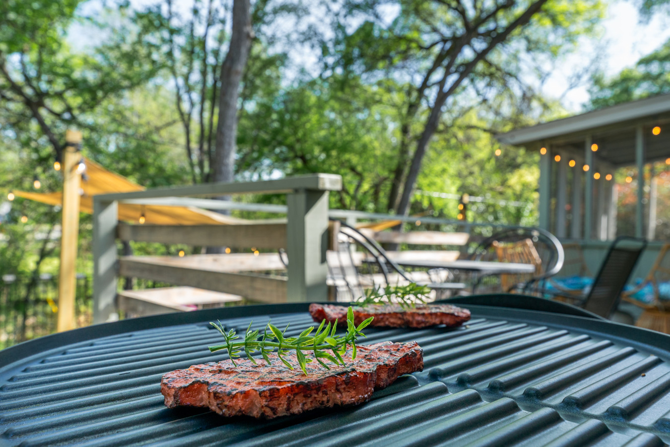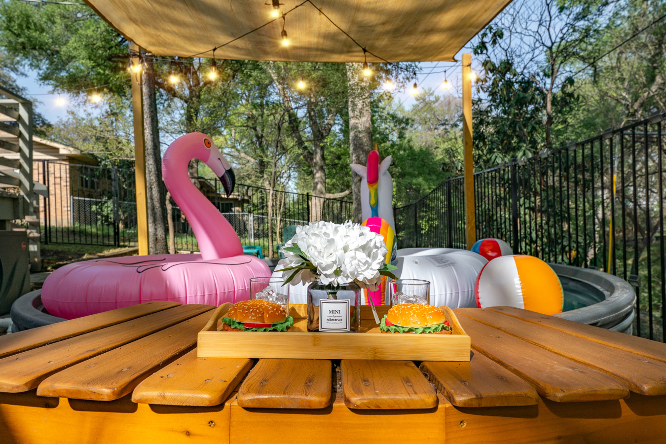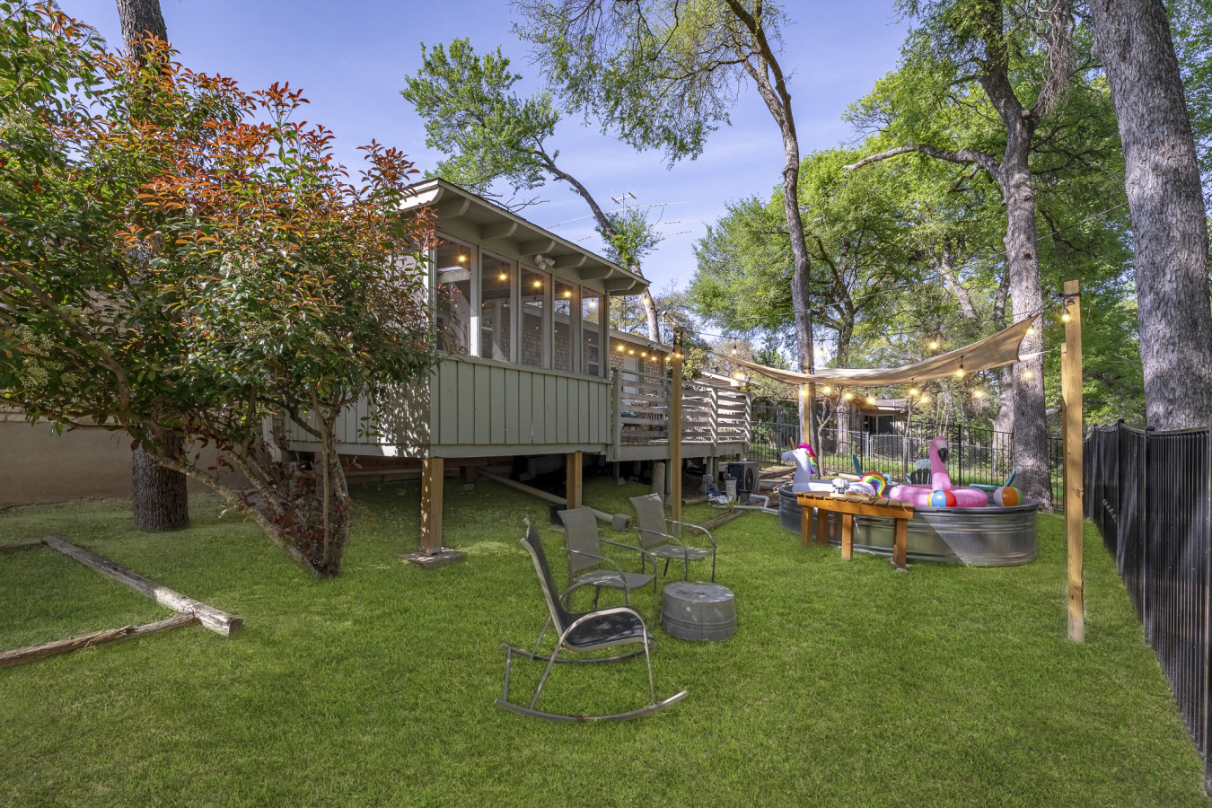 When you’re ready to cool off, step outside to the cowboy pool—perfect for a refreshing dip under the Texas sun, with optional heating available. The backyard offers plenty of space to lounge, relax, and soak in the Austin vibes.