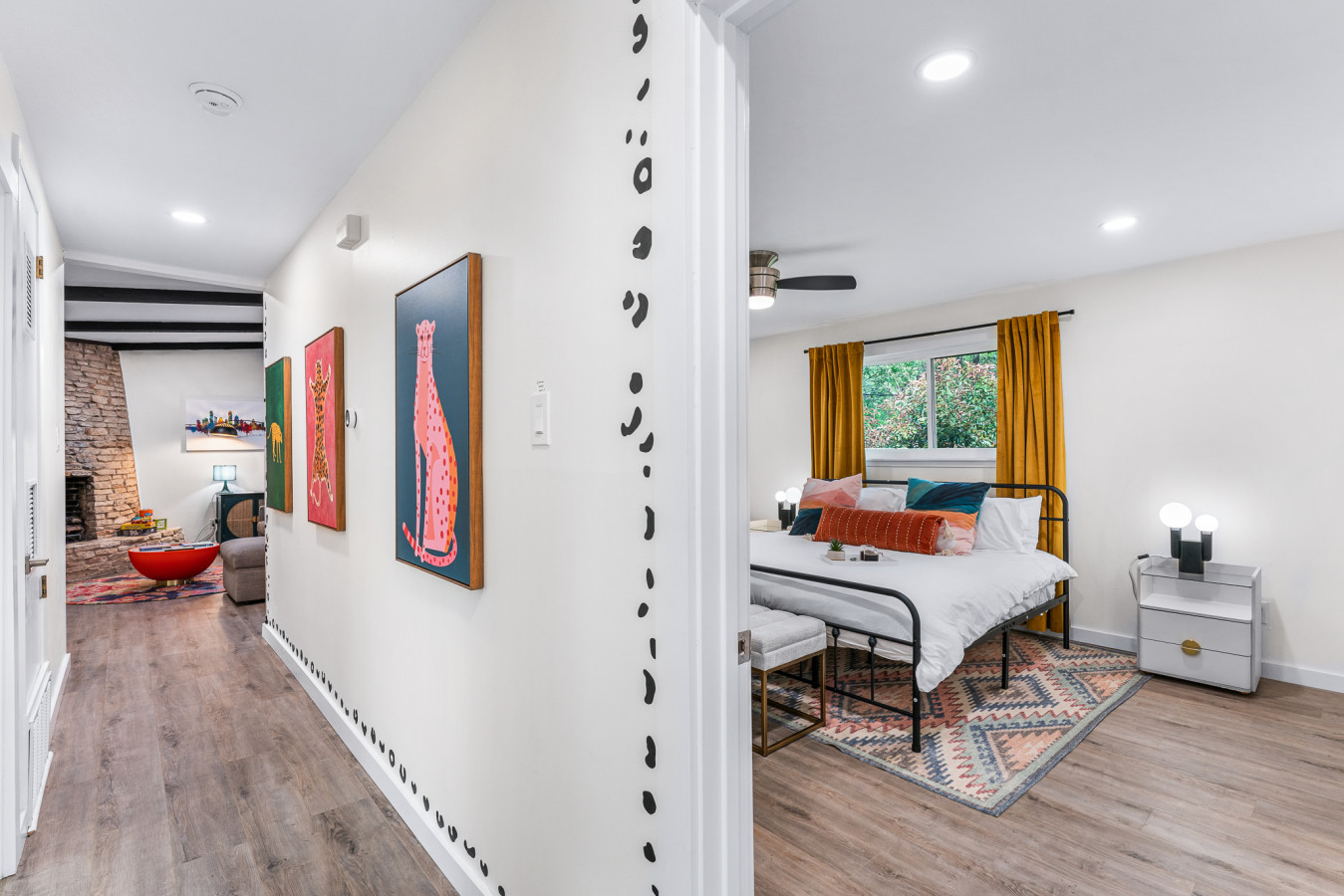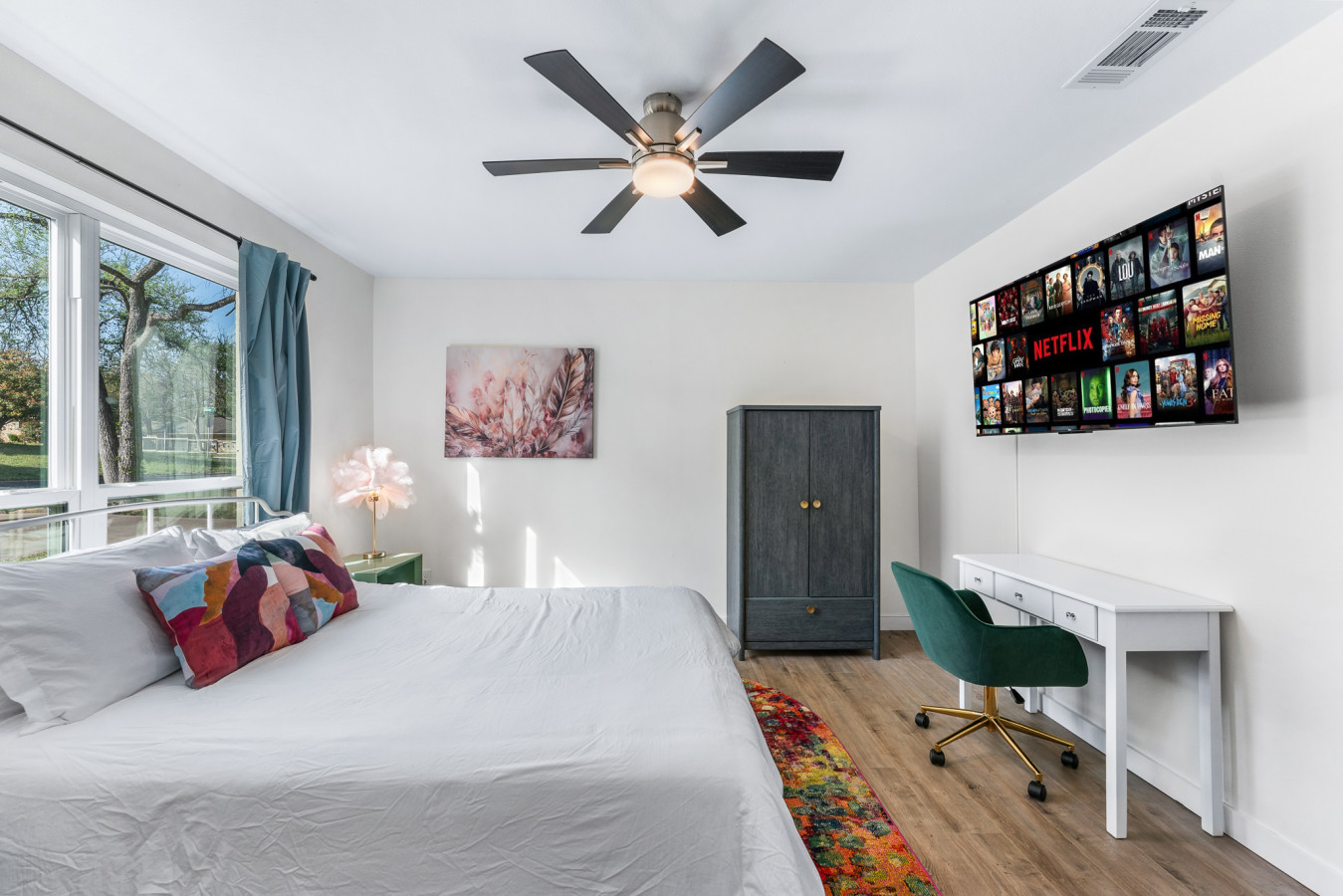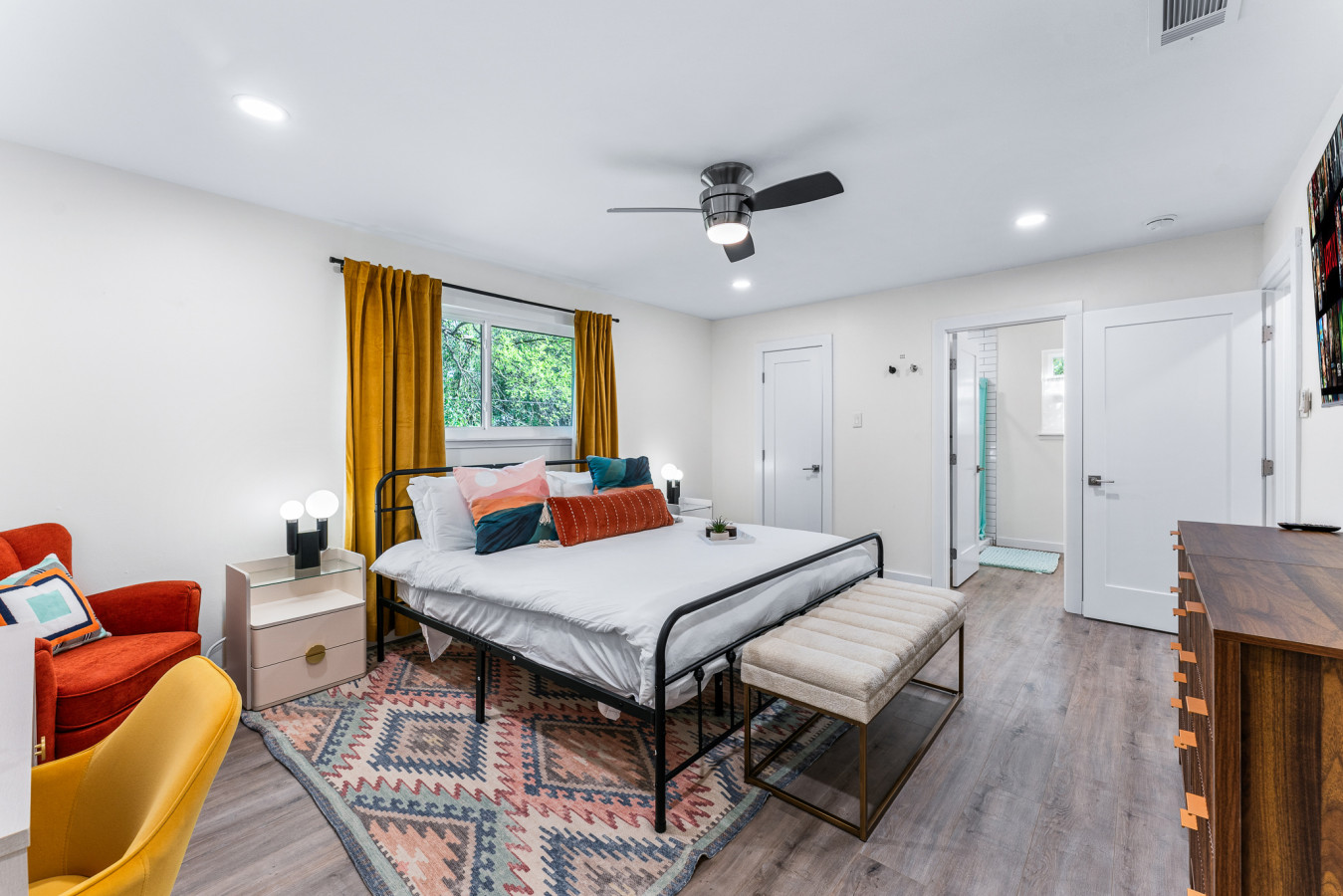 At the end of the day, retreat to one of the four thoughtfully designed bedrooms. The primary suite features a plush king bed for a restful night’s sleep, while the additional rooms offer a mix of queen beds and a twin-over-twin bunk, ensuring a comfortable stay for everyone. A pull-out sleeper and air mattress provide extra space for larger groups. With two full bathrooms, getting ready in the morning is hassle-free. Whether you’re here for adventure, relaxation, or both, this home is your perfect Austin escape!