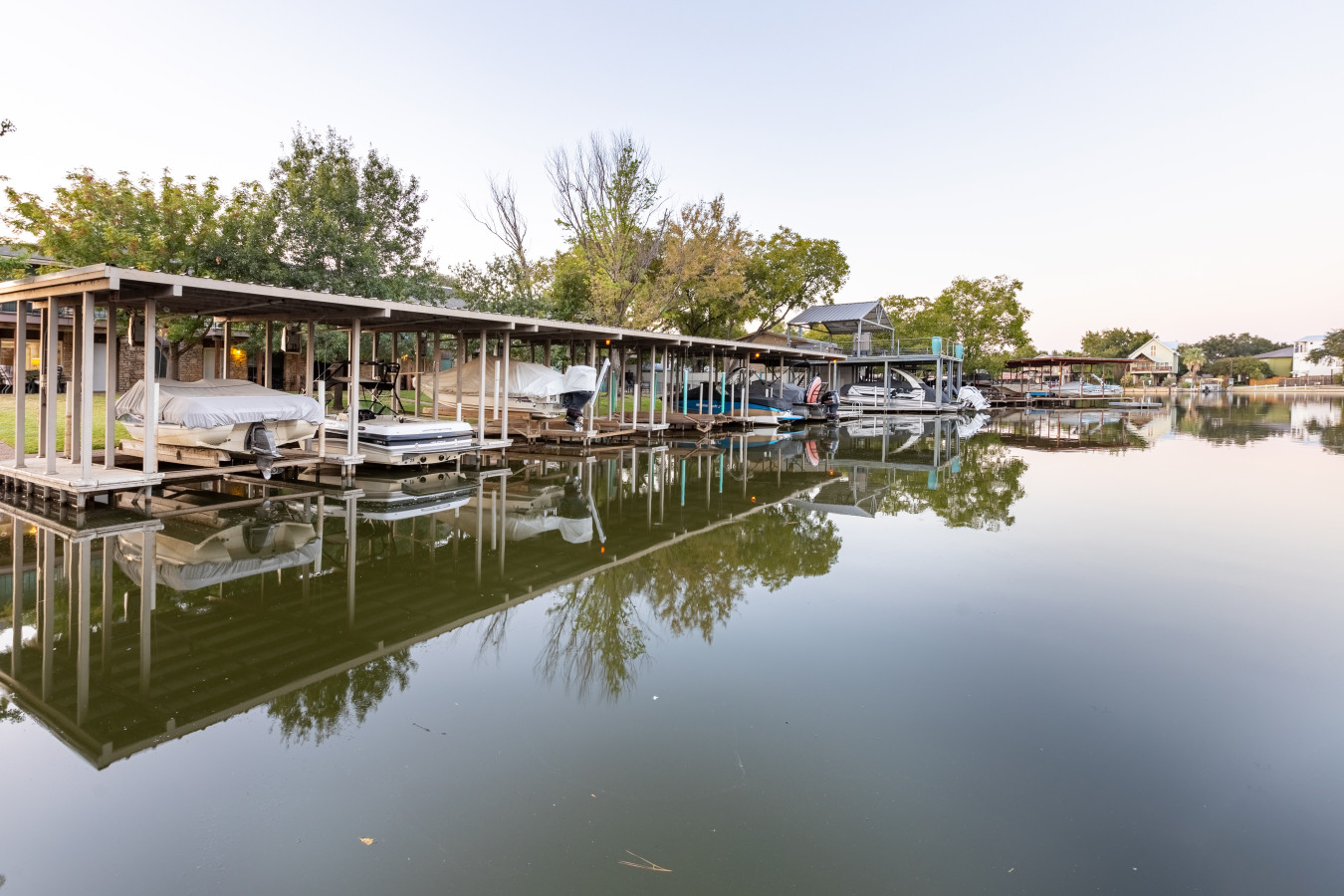 Just beyond, the waterfront and boat docks create a calm, peaceful backdrop that instantly puts you in vacation mode. The still water, boats lined along the docks, and open sky give you that true lake escape feeling.