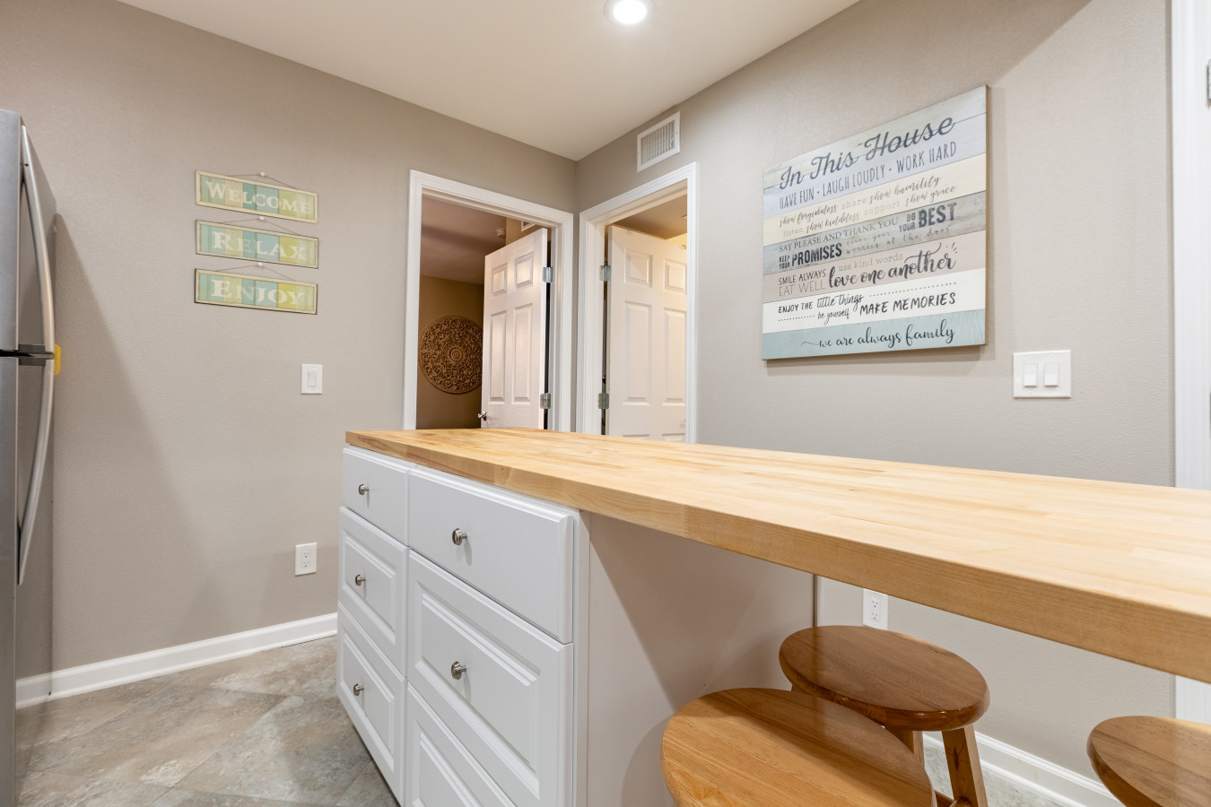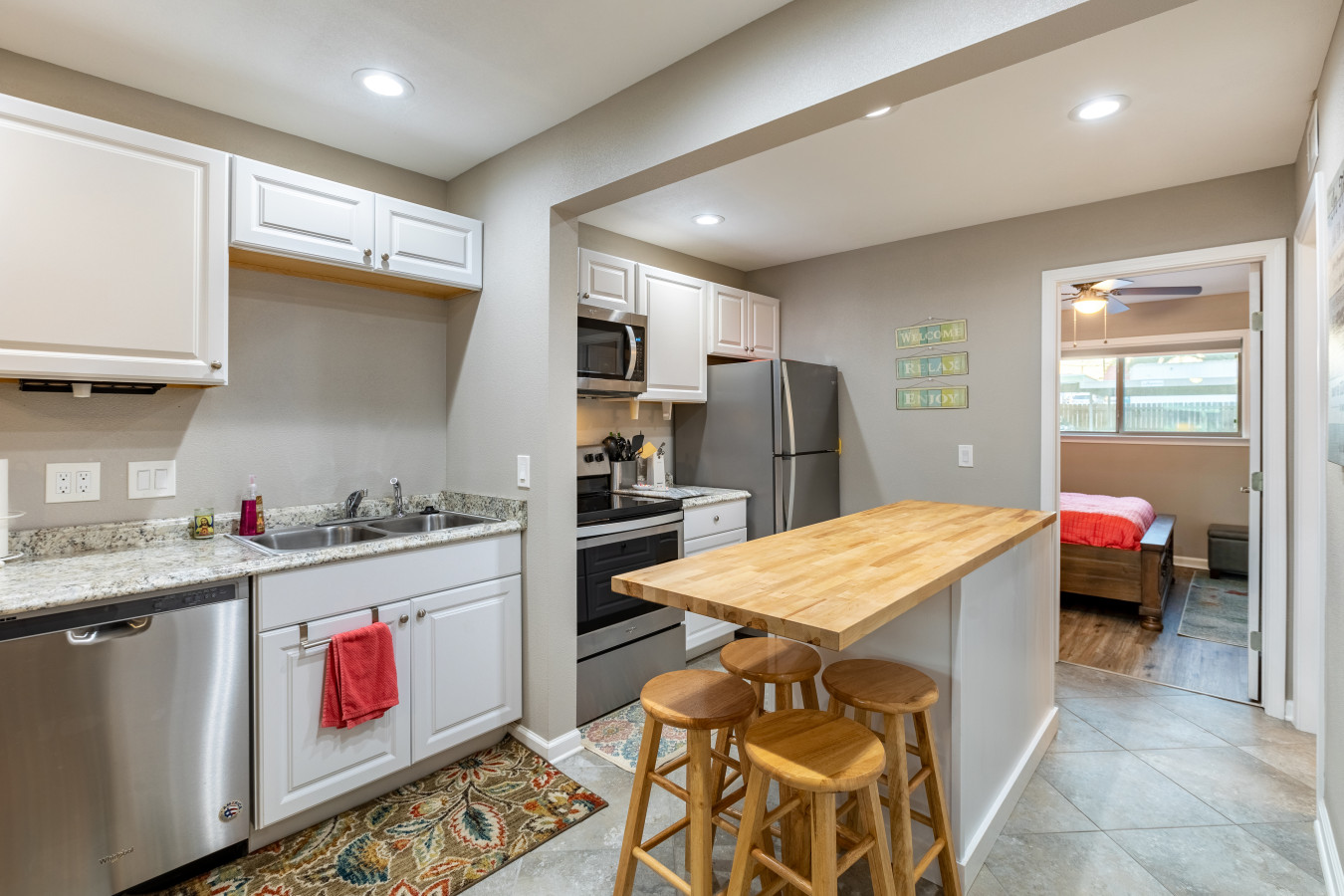 The kitchen is fully equipped with modern appliances and a convenient breakfast bar with seating, ideal for morning coffee or casual meals before heading out.