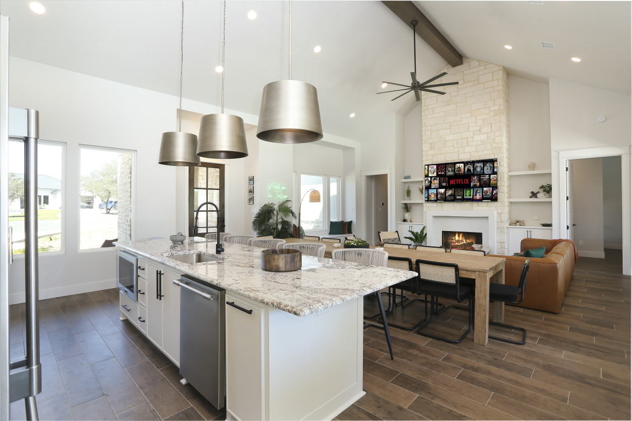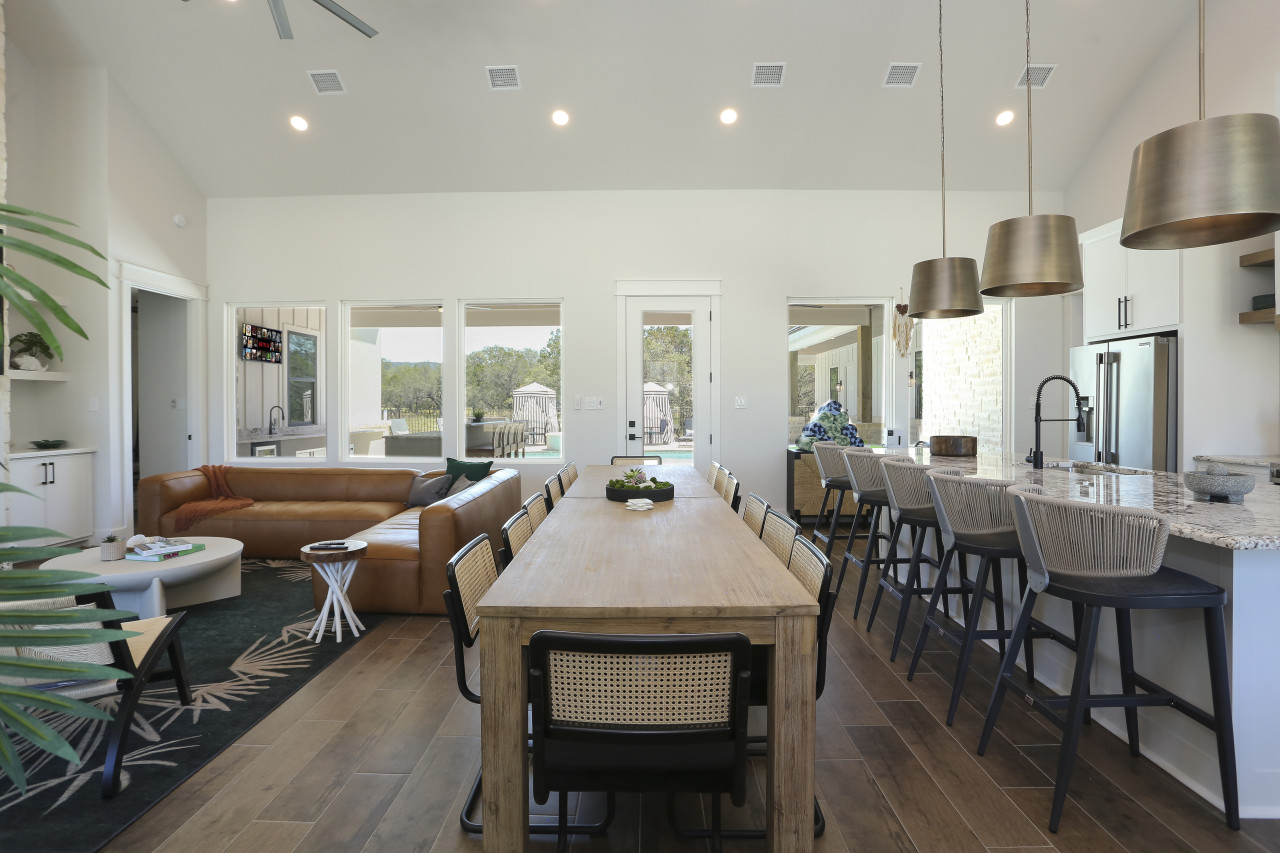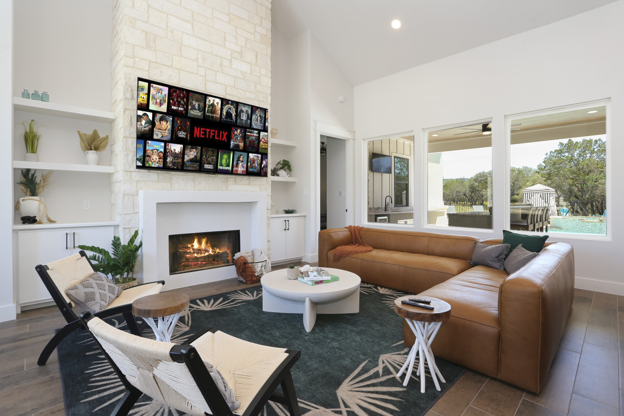 The living room boasts a large leather sectional, perfect for lounging, with an 85" Smart TV for your favorite shows and movies. The gourmet kitchen is fully equipped, making meal prep a breeze. The kitchen also has a coffee bar with provided coffee pods to make a great start to your morning. The adjacent outdoor kitchen offers additional space for BBQs, complete with a propane and charcoal grill and outdoor dining area. The outdoor space is designed for fun and relaxation, featuring a giant Connect 4 game, cornhole, a cozy outdoor fireplace, and a stunning view of the night sky.
