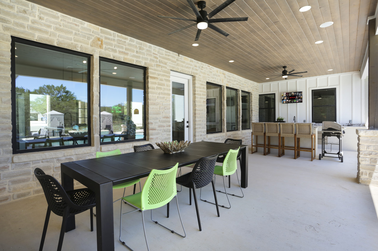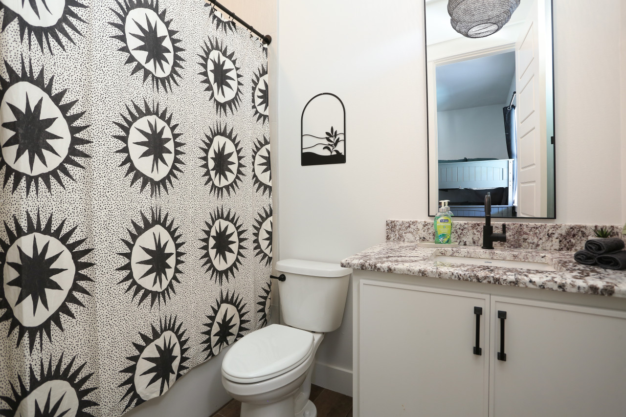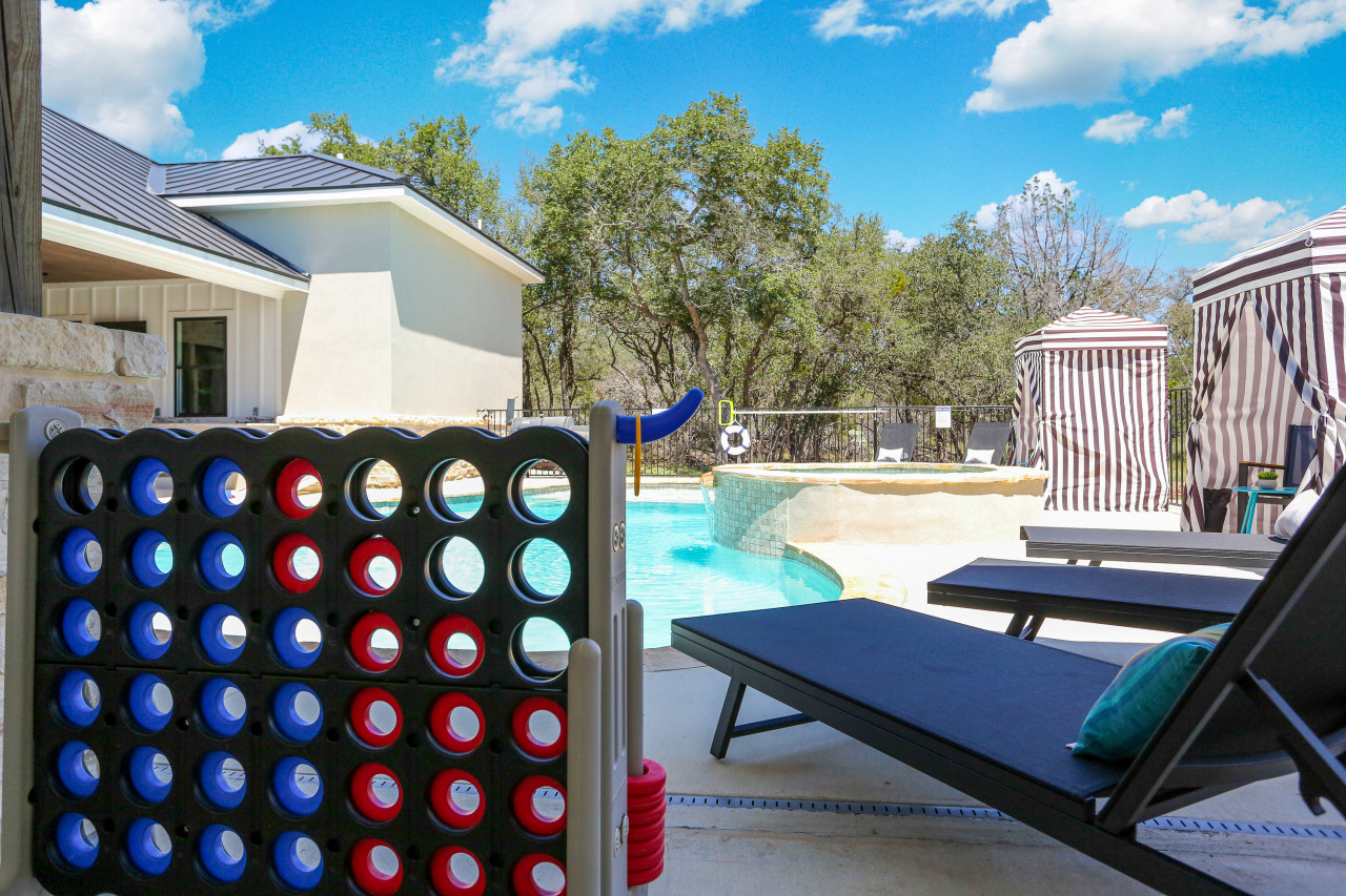 Outside, you’ll find a heated pool (optional), a hot tub, and plenty of loungers and cabanas to relax in. Play giant Connect 4 or cornhole, or sit around the cowboy fire pit in comfy Adirondack chairs. Our outdoor kitchen has both propane and charcoal grills, so you can cook up delicious meals and enjoy them outside. This home backs up to a wooded area so you have complete privacy!