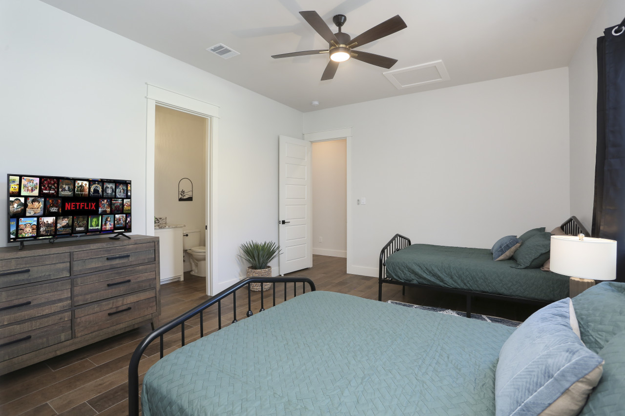 Bedroom 2: Full size beds with an attached bathroom