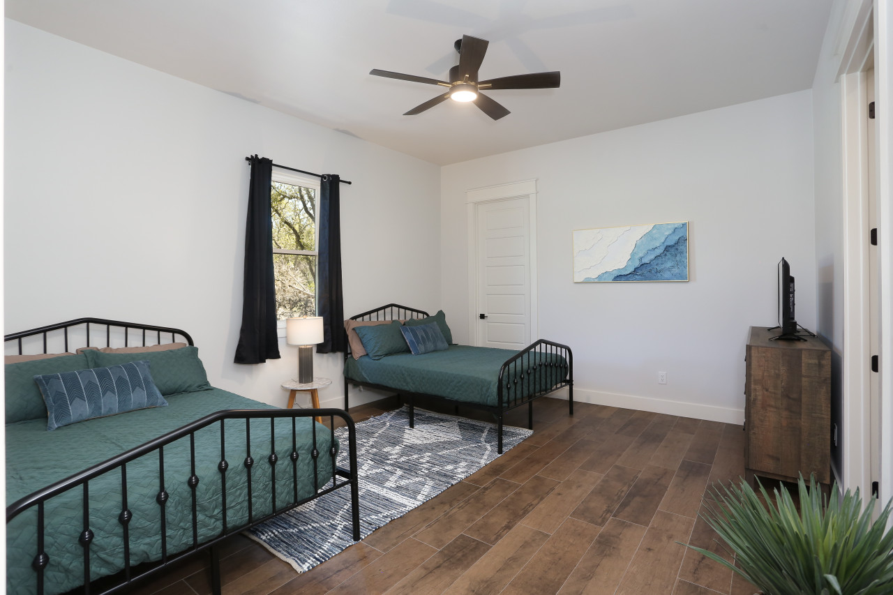 Escape to Tulum, a luxurious 3,100 square feet 5-bedroom, 5.5-bath retreat in Concan, TX, perfect for family or group getaways. Relax by the pool, unwind in the hot tub, or enjoy a private movie theater under 100,000 stars. The outdoor area features a kitchen, BBQ grills, a fire pit, and games like Connect 4 and cornhole. With space for 28 guests, each bedroom has an en-suite bathroom, ensuring comfort for everyone. Book Tulum for an unforgettable vacation!