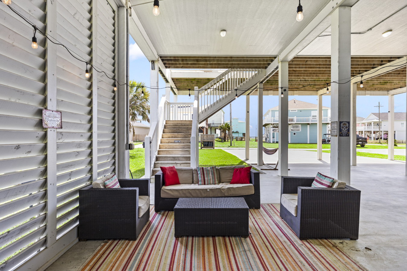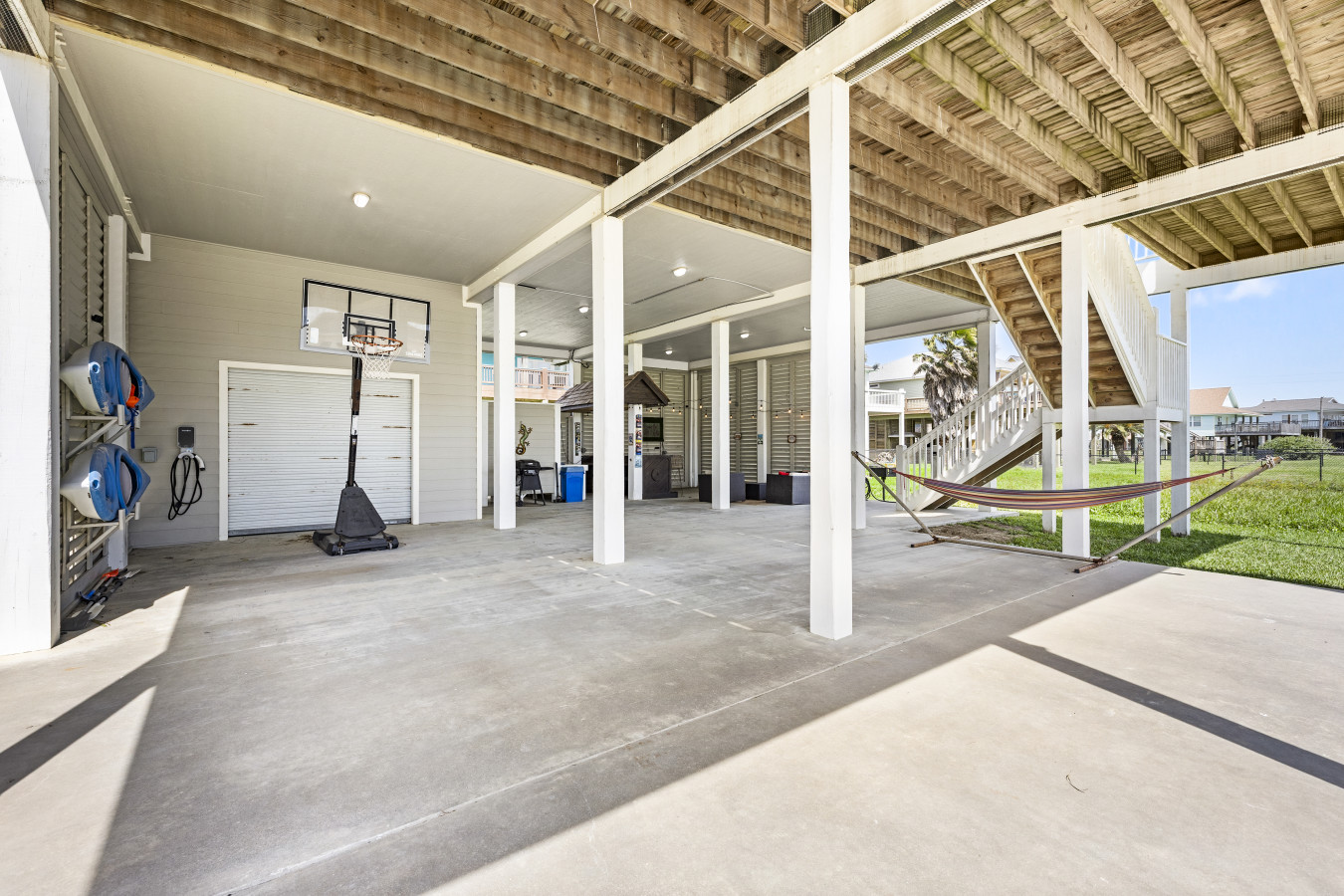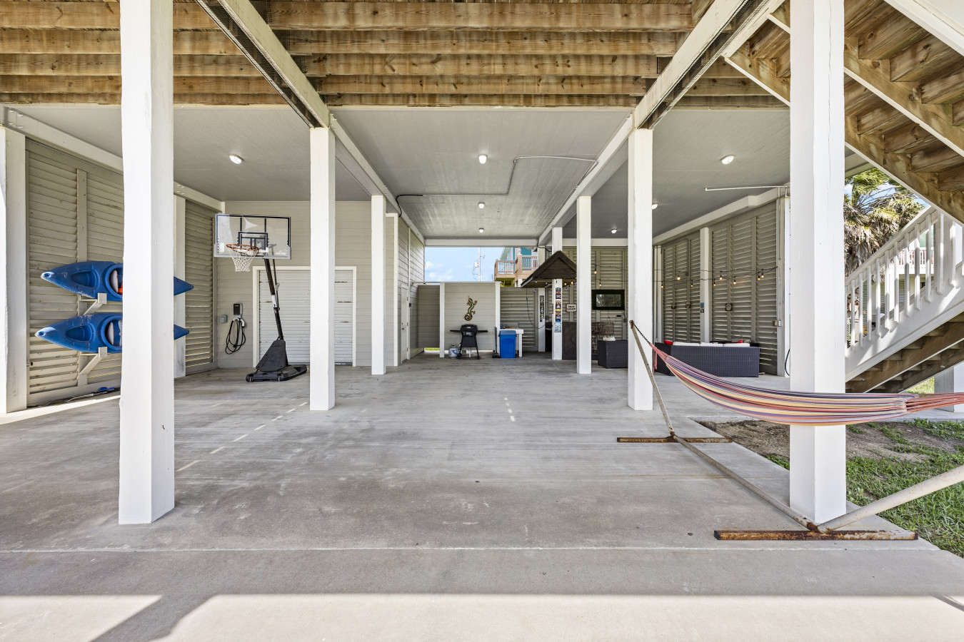 The upstairs deck is pure magic at golden hour, your seat to those unforgettable coastal sunsets. Downstairs, the shaded hangout space becomes your go-to spot during the day, with swings, seating, and plenty of room to relax, play, or just enjoy the breeze.