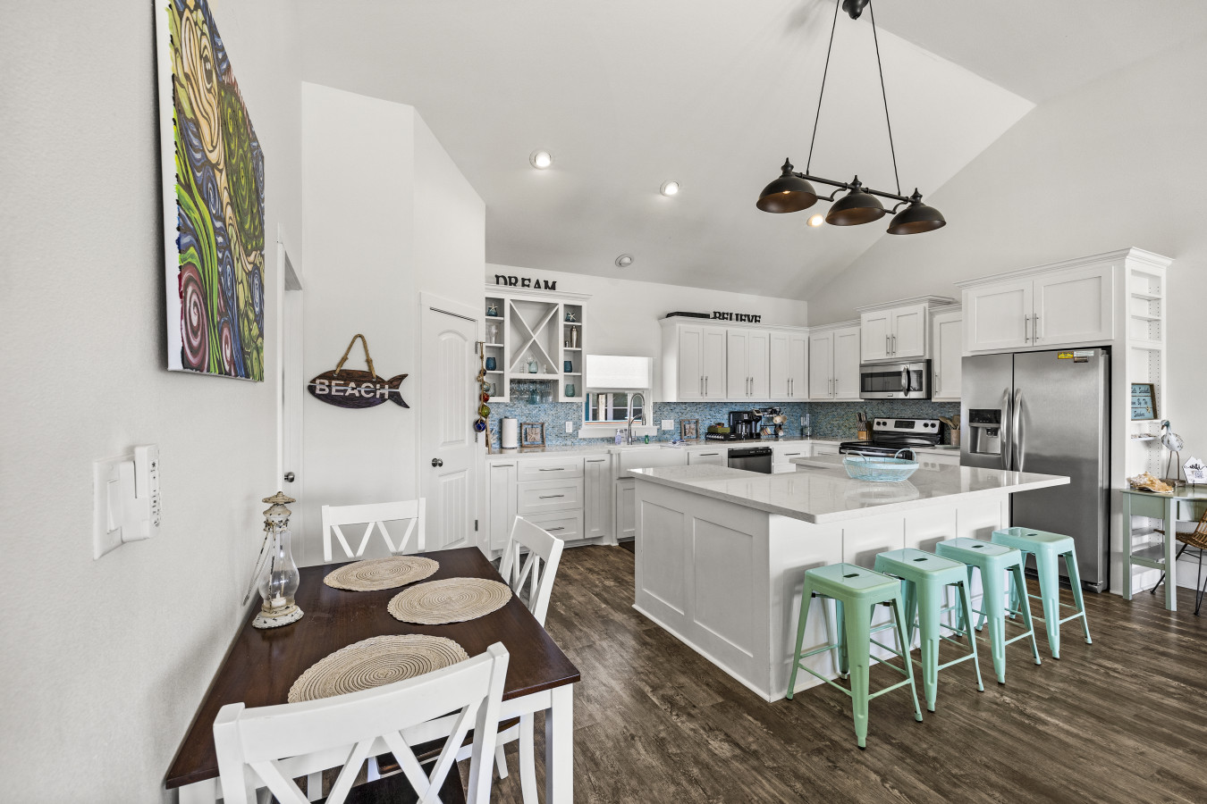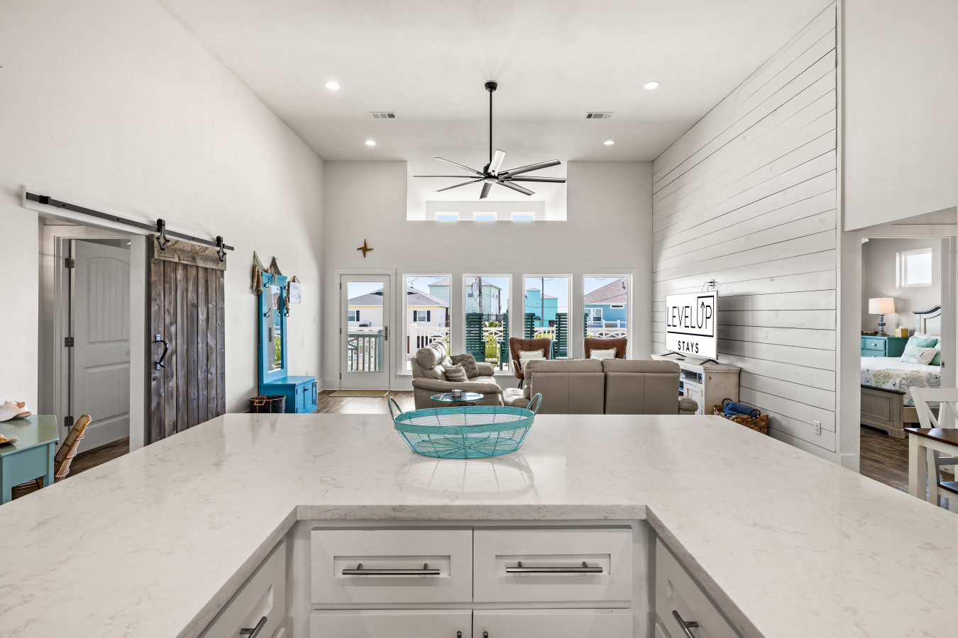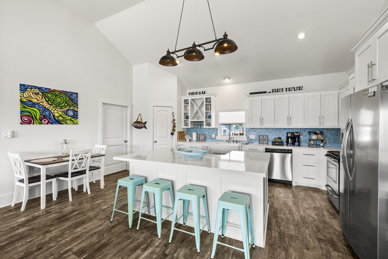 Upstairs, the main living area brings everyone together. Kick back on comfortable seating, stream your favorite shows, or gather around after a beach day to share stories and laughs. The flow between the living room, dining area, and kitchen makes it easy to stay connected no matter what’s going on.