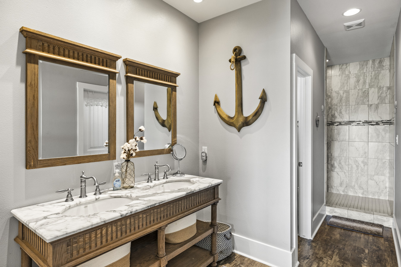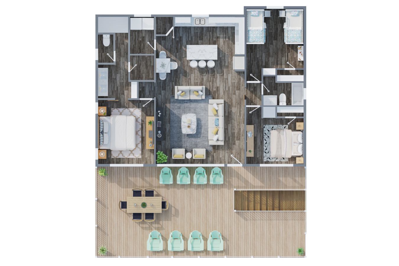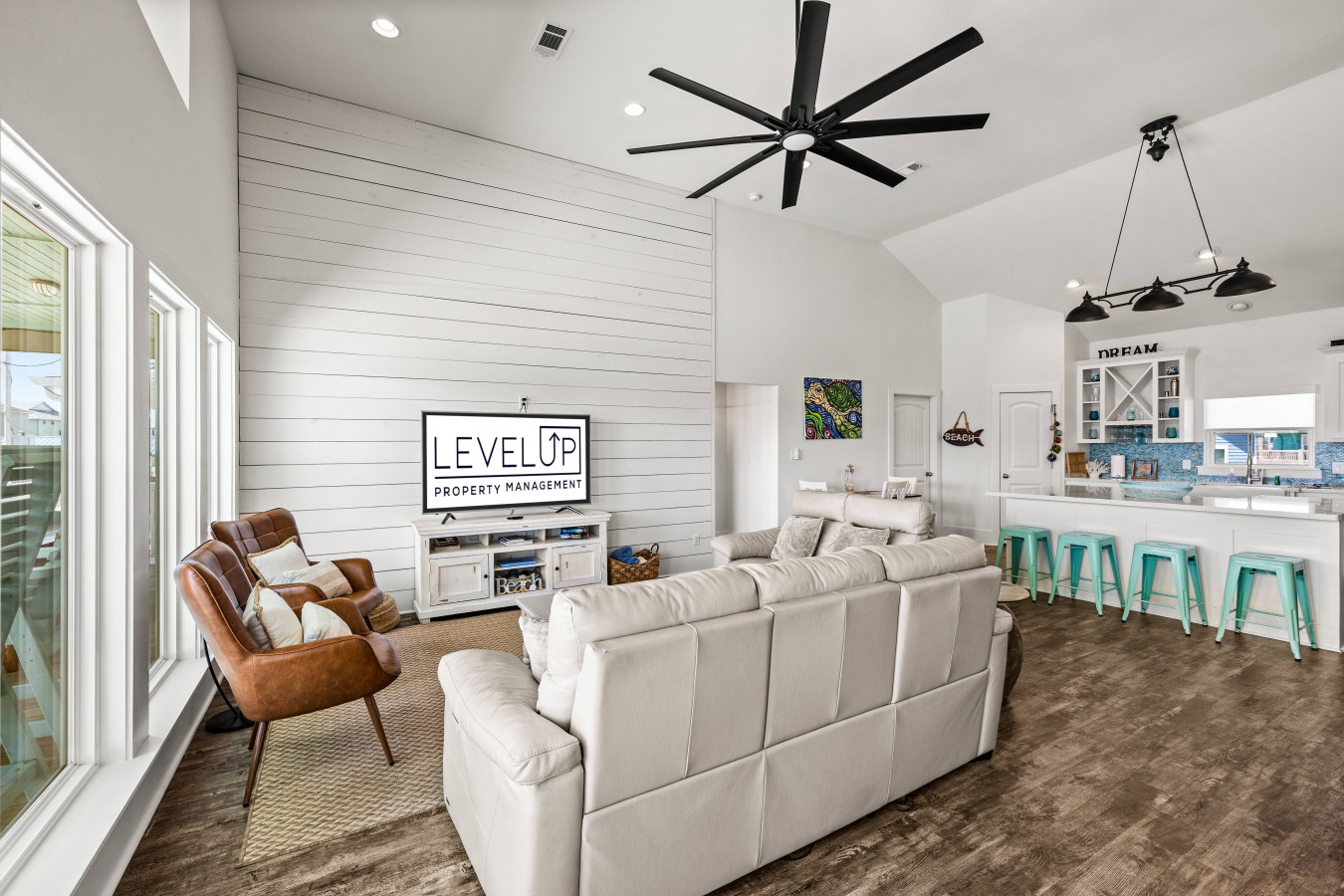 Upstairs, the main living area brings everyone together. Kick back on comfortable seating, stream your favorite shows, or gather around after a beach day to share stories and laughs. The flow between the living room, dining area, and kitchen makes it easy to stay connected no matter what’s going on.