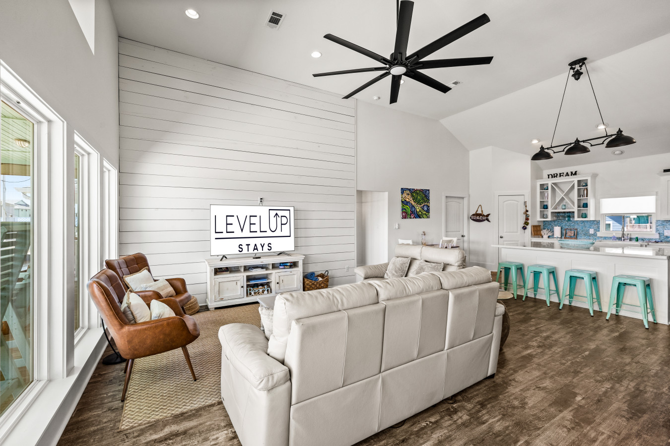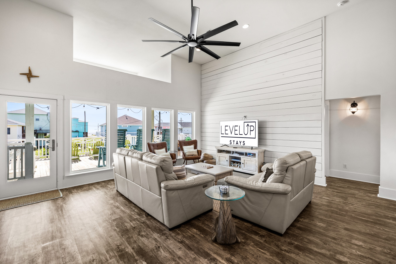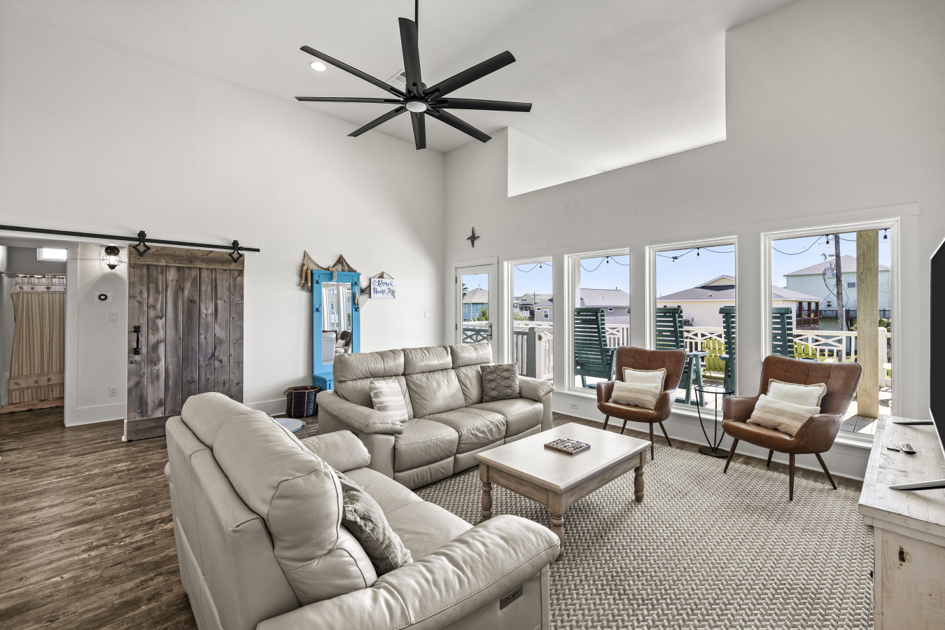 This spacious, light-filled beach home is designed for gathering, relaxing, and soaking in that effortless coastal energy. With an open-concept layout, breezy interiors, and multiple outdoor hangout spaces, it’s the kind of place where mornings start slow and nights end under glowing string lights.