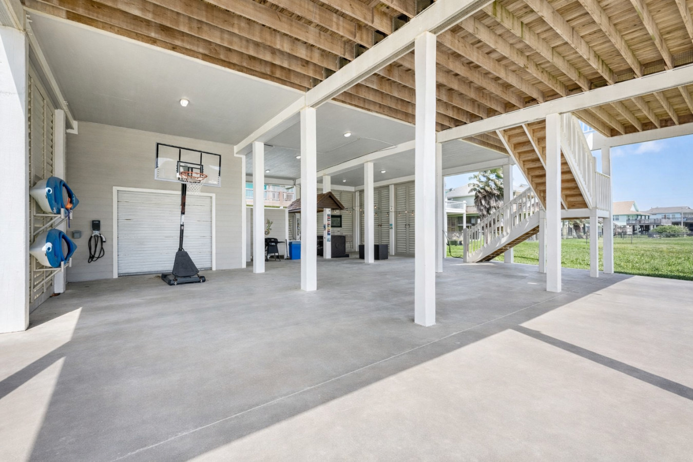 • Downstairs hangout area – Swings, seating, and space to relax in the shade