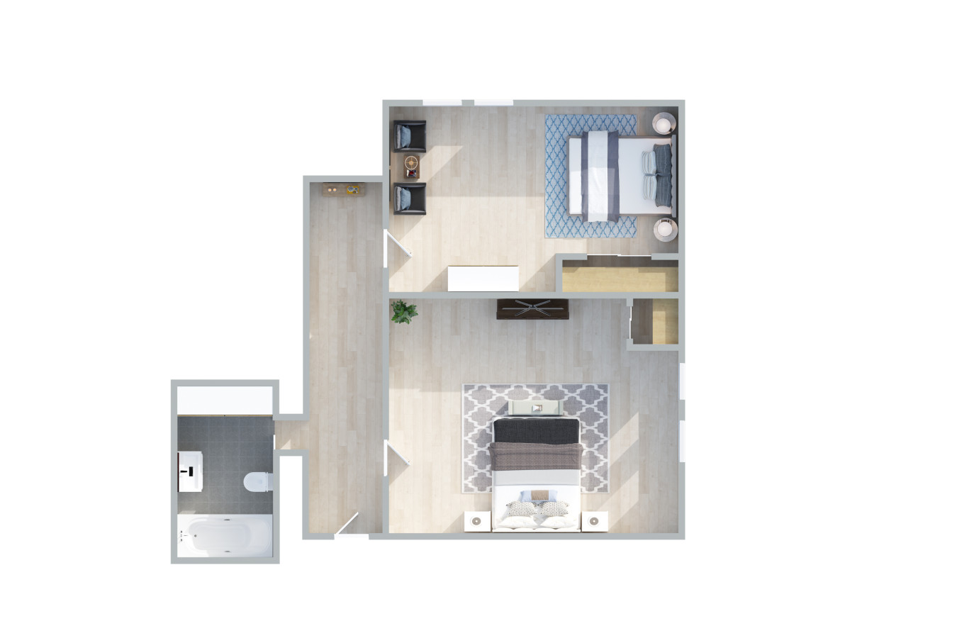 •Two queen bedrooms – one full bathroom, mini-fridge, and coffee station.
