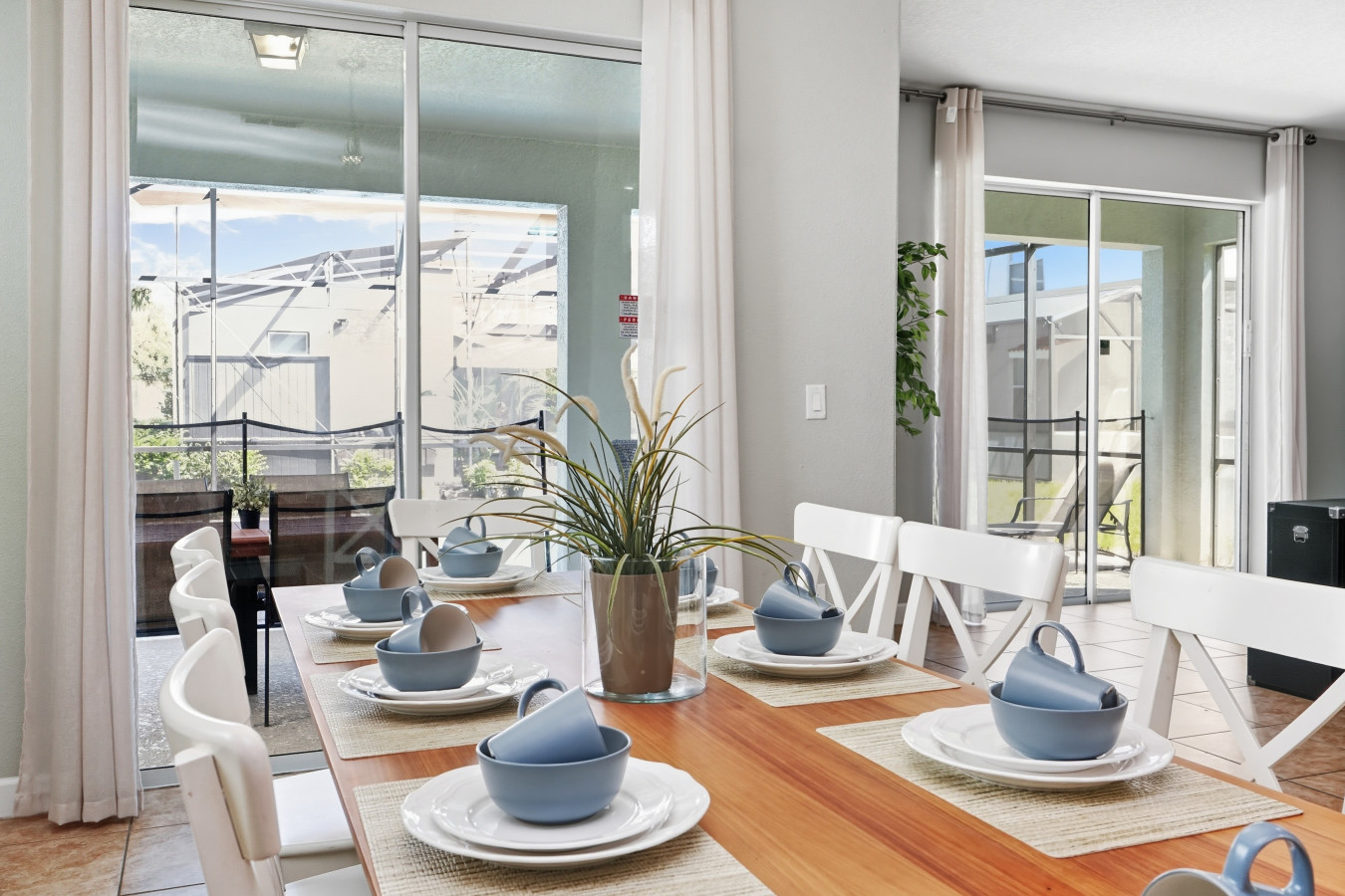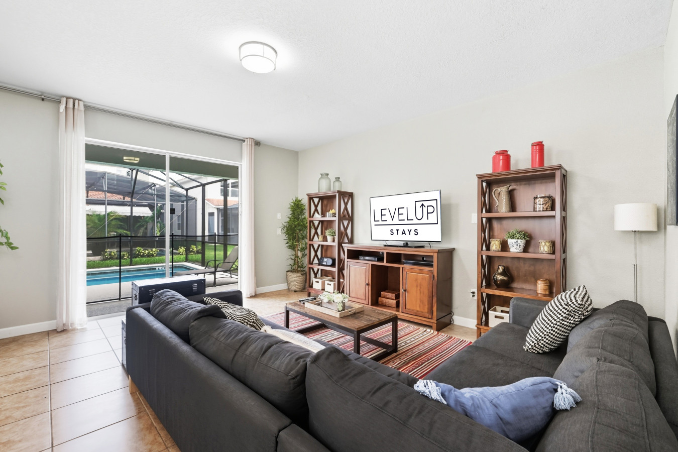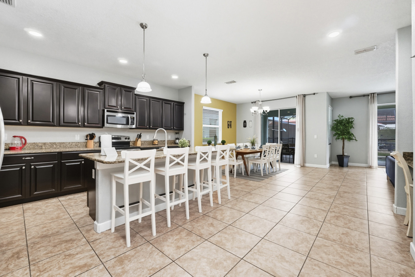 When it’s time to rest, you’ll love the master bedroom with a king bed and en suite bathroom featuring both a tub and a standing shower, a luxurious way to begin or end the day. The other bedrooms are generously sized: two queen bedrooms, and two bedrooms each with two full beds, plus one more queen room, ideal for kids, friends, or extended family. Outside, the private screened pool and outdoor seating make for perfect afternoons or evenings under the Florida skies.