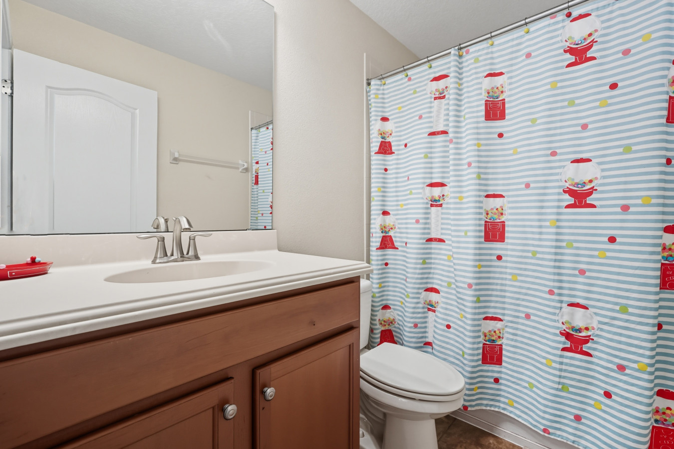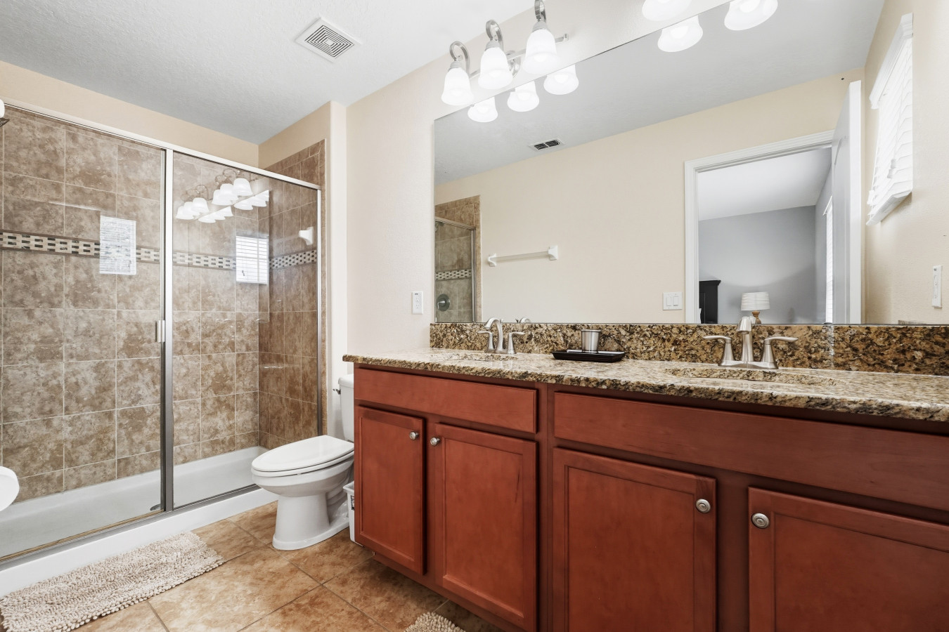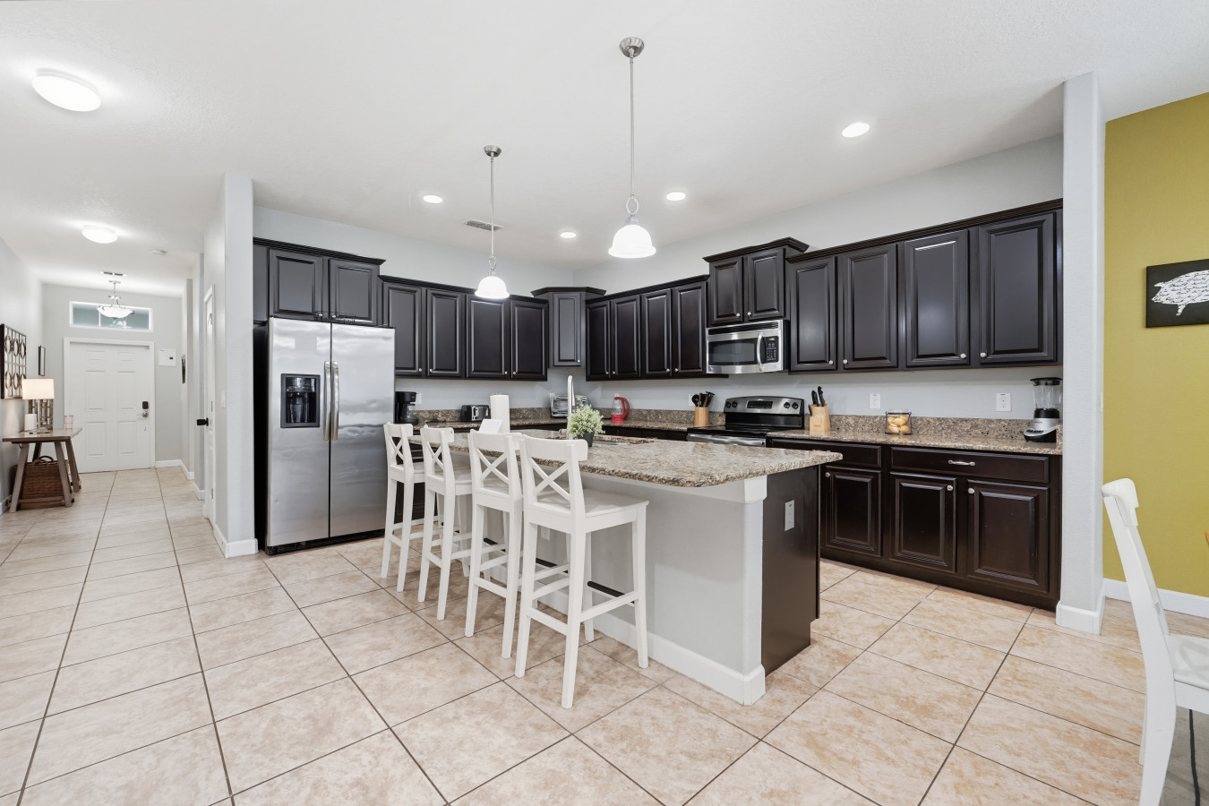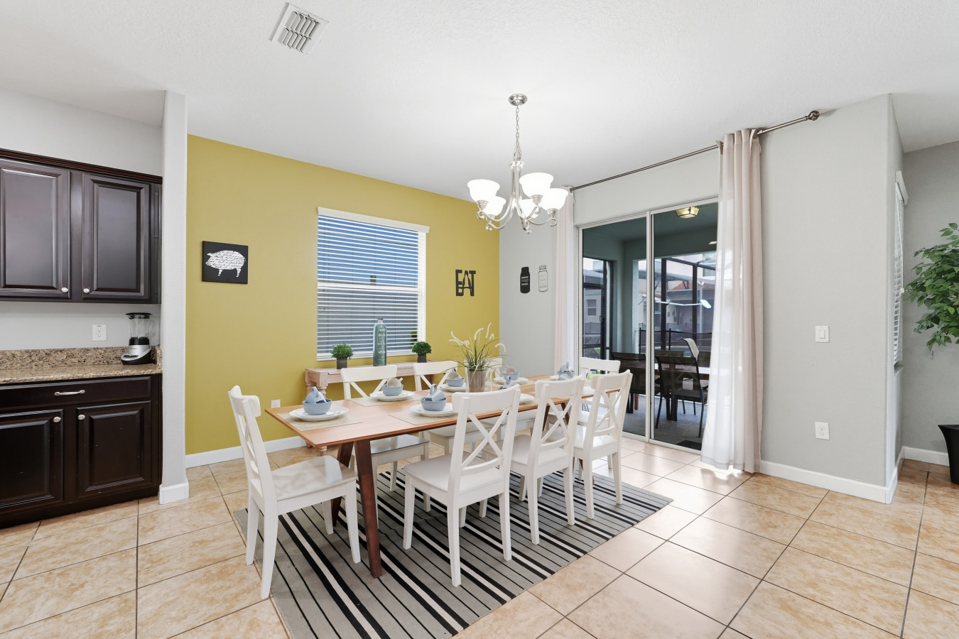 When it’s time to rest, you’ll love the master bedroom with a king bed and en suite bathroom featuring both a tub and a standing shower, a luxurious way to begin or end the day. The other bedrooms are generously sized: two queen bedrooms, and two bedrooms each with two full beds, plus one more queen room, ideal for kids, friends, or extended family. Outside, the private screened pool and outdoor seating make for perfect afternoons or evenings under the Florida skies.