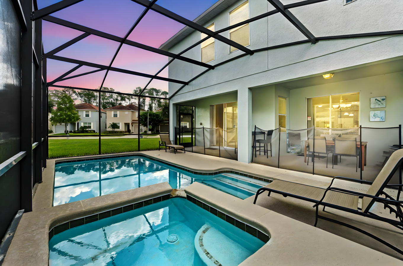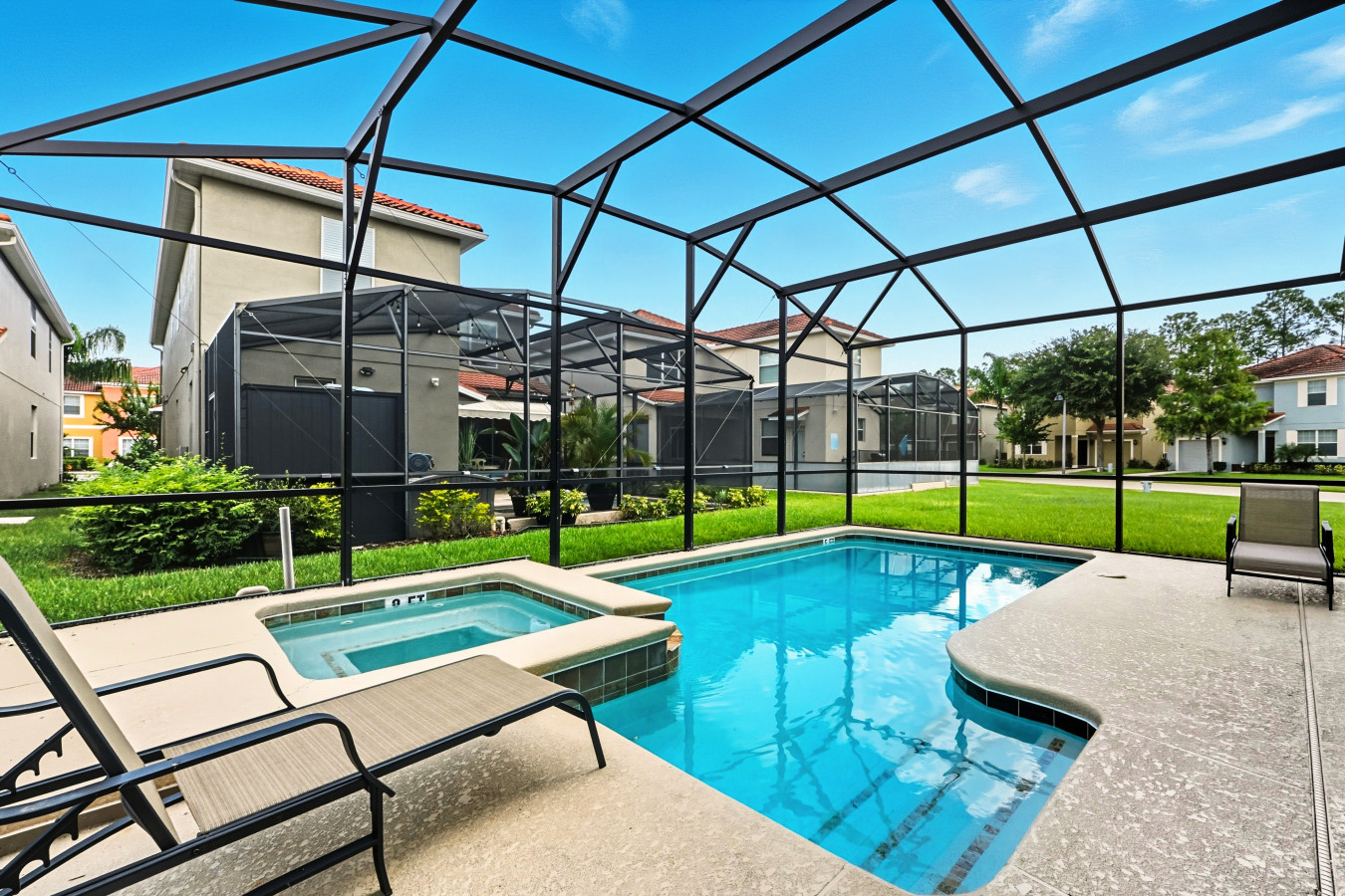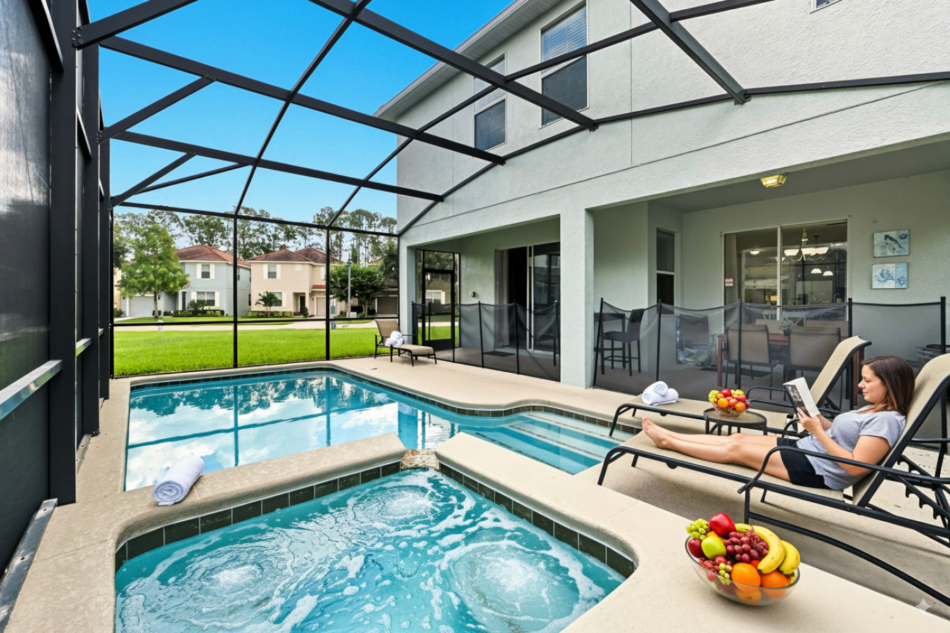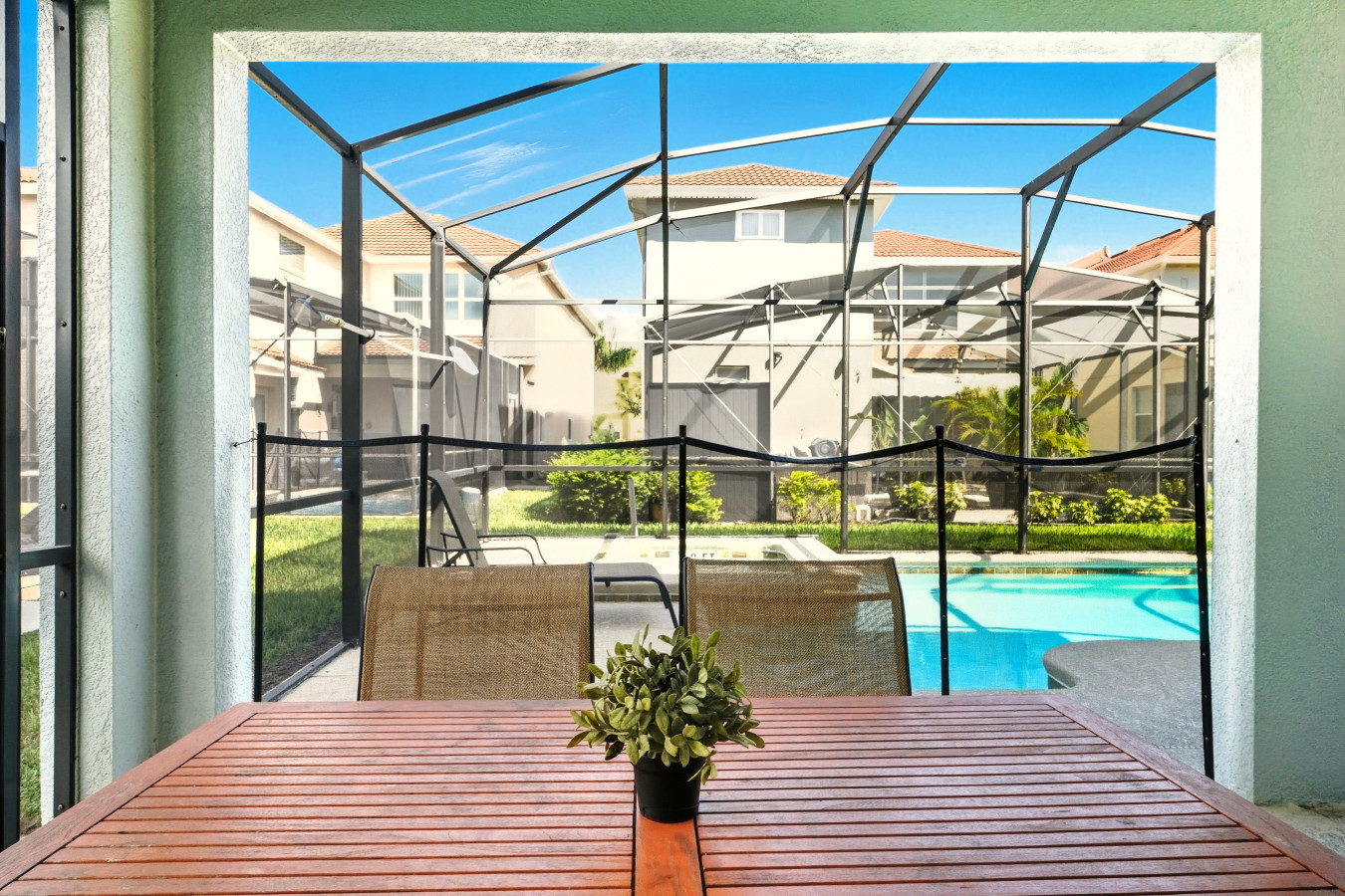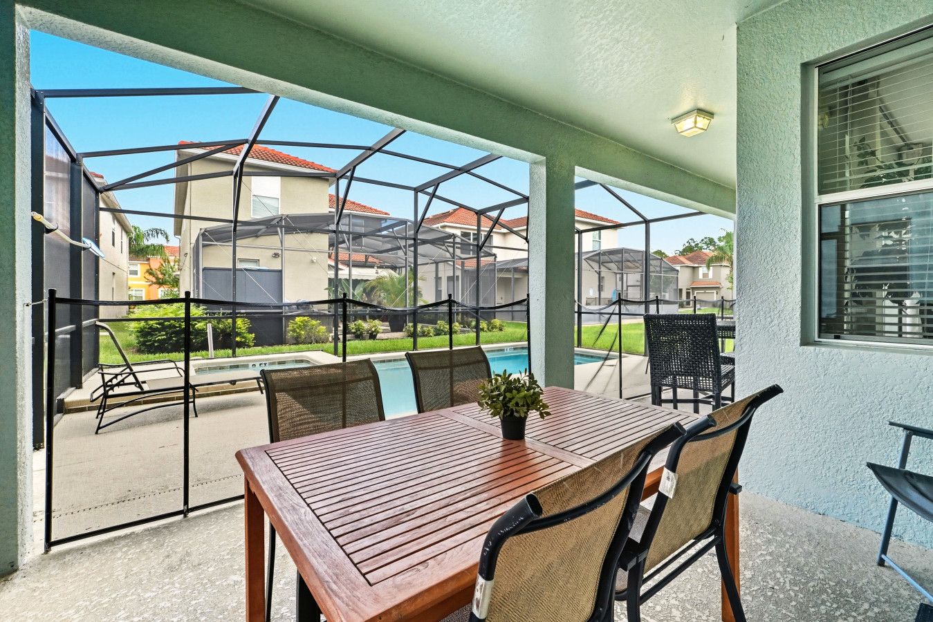 • Private heated screened pool (pool/spa heating optional, additional fee applies) + outdoor seating area so you can unwind in sun or shade in total privacy.