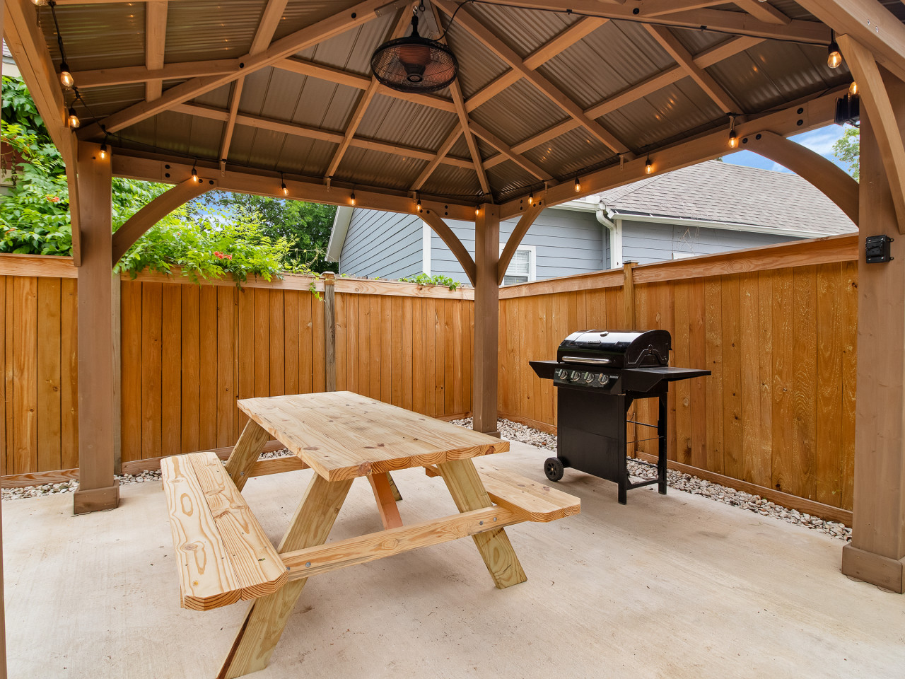 Outside is where this home truly steals the show. Step onto the patio and you’ll instantly want to linger, fire up the grill for an easy dinner, gather everyone around the fire pit, and let the evening glow set the mood. With cozy seating, twinkle lights, and that perfect open-air vibe, it’s the kind of space you’ll plan your nights around and the reason you’ll wish you booked a longer stay.