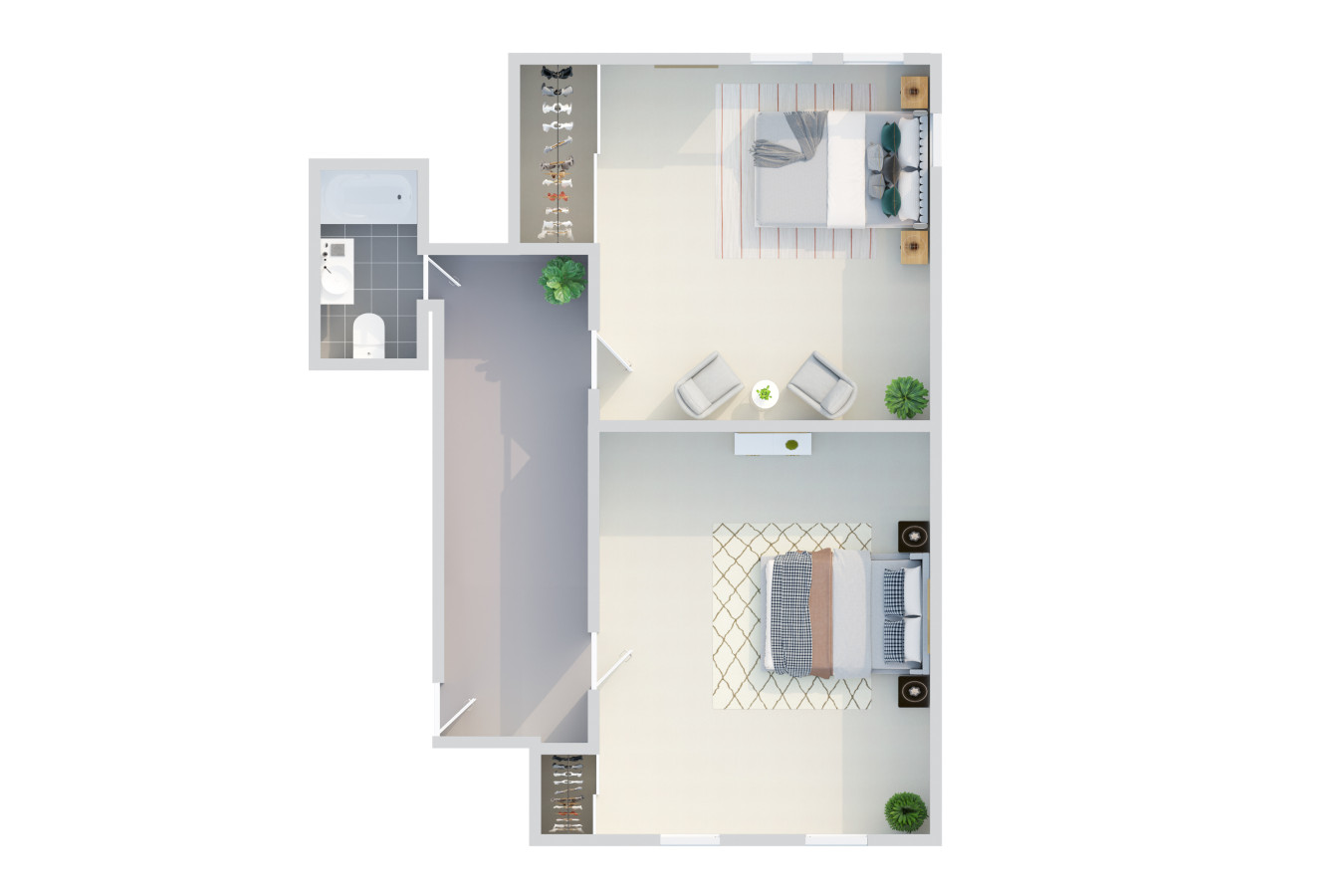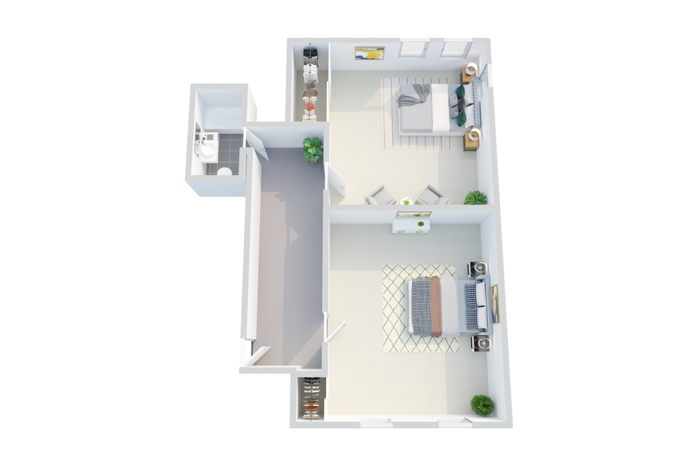 •Two queen bedrooms – one full bathroom, mini-fridge, and coffee station.