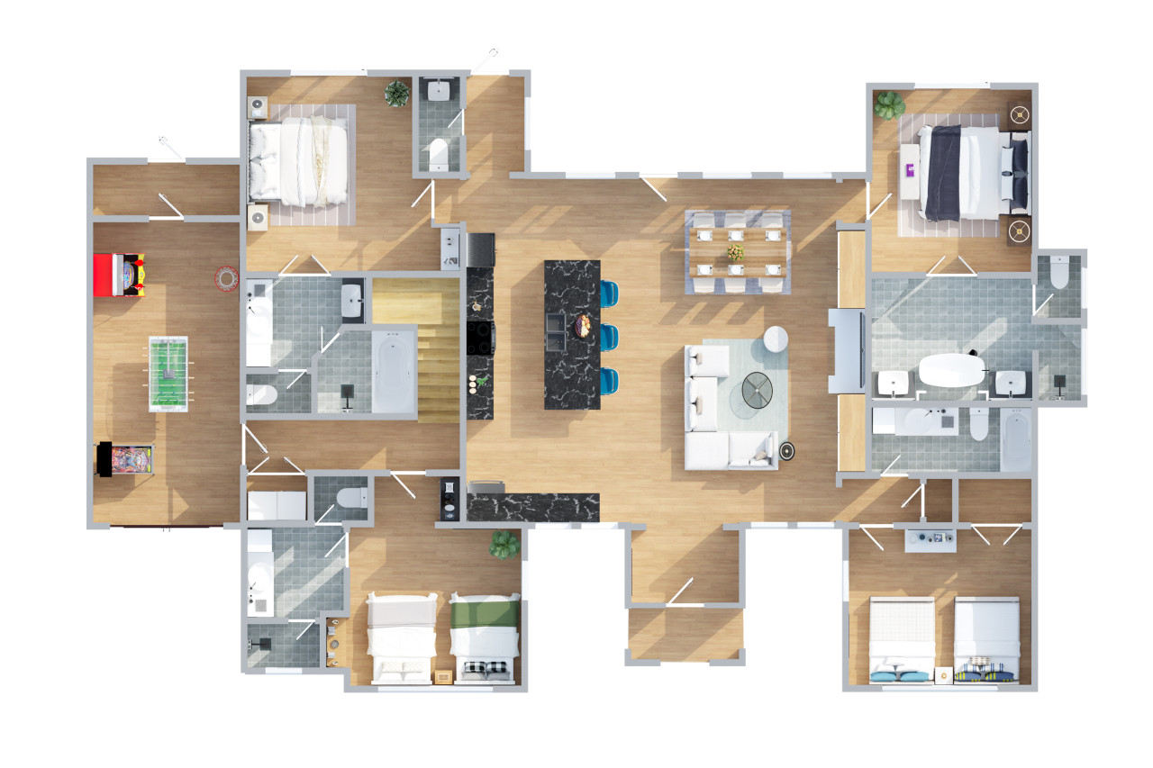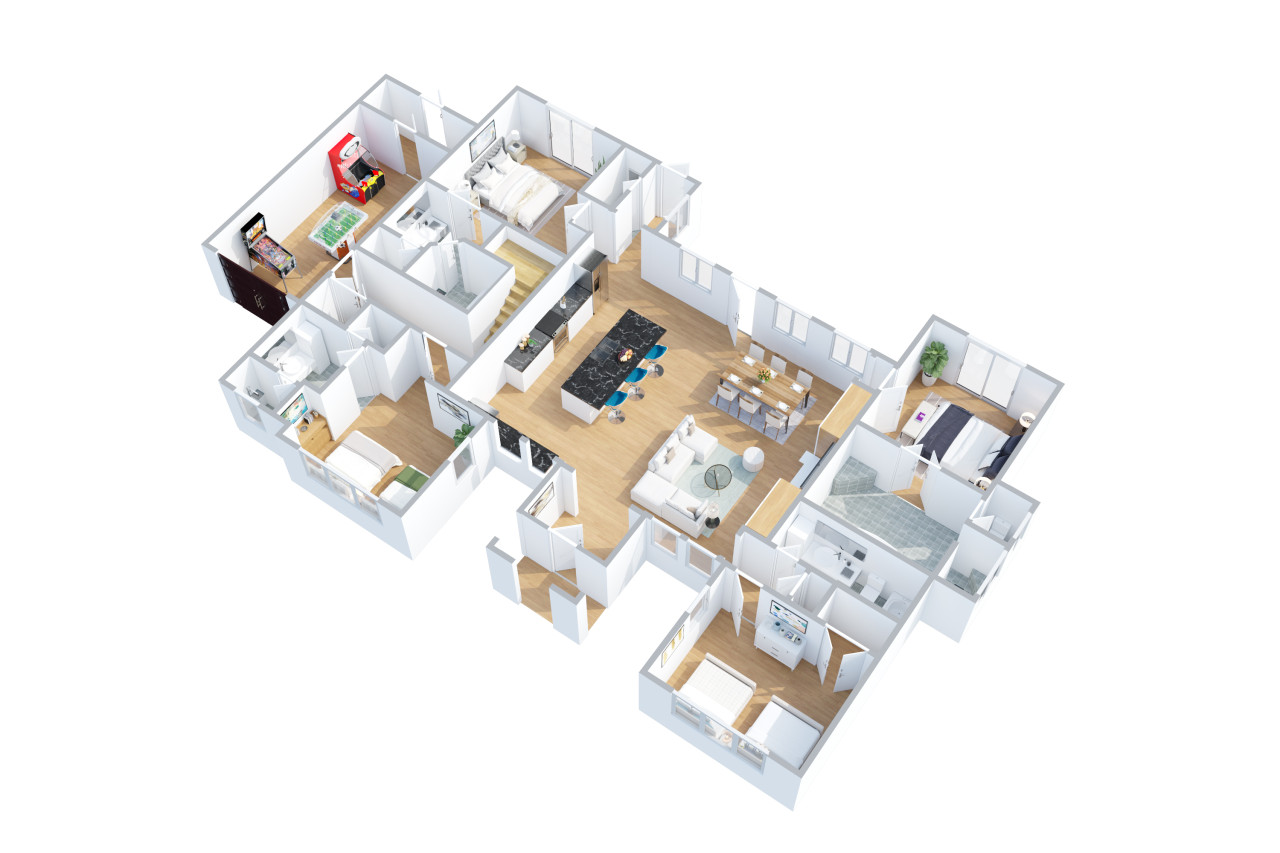 At the end of the day, you and your family can unwind in the fully equipped kitchen, relax in the spacious living areas, or spend some quality family time in the new arcade. With a 120-inch projector, golf, pinball, and basketball games, it's the perfect spot to create unforgettable family memories and enjoy quality time together.