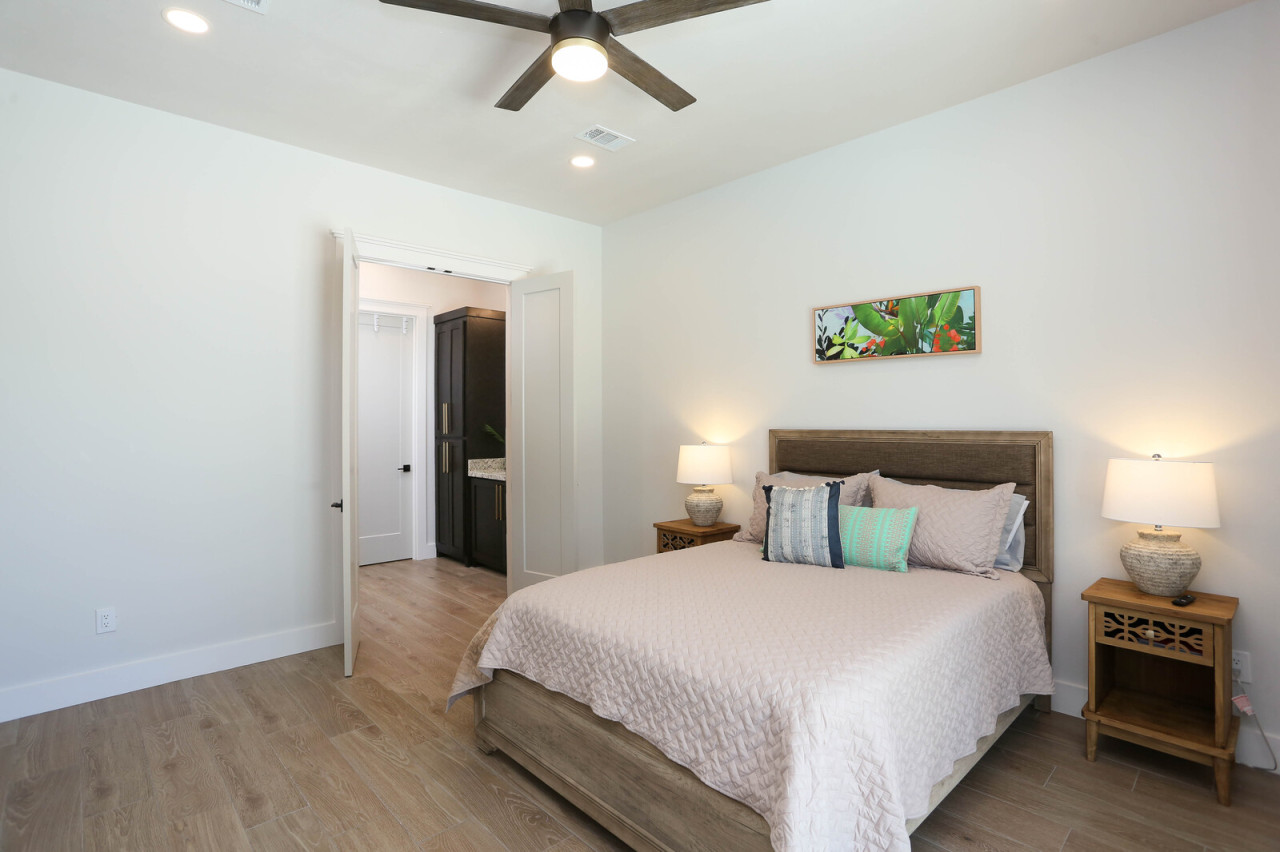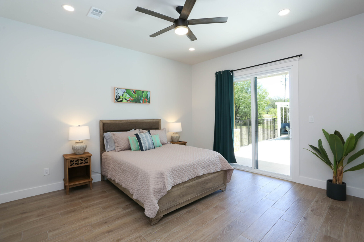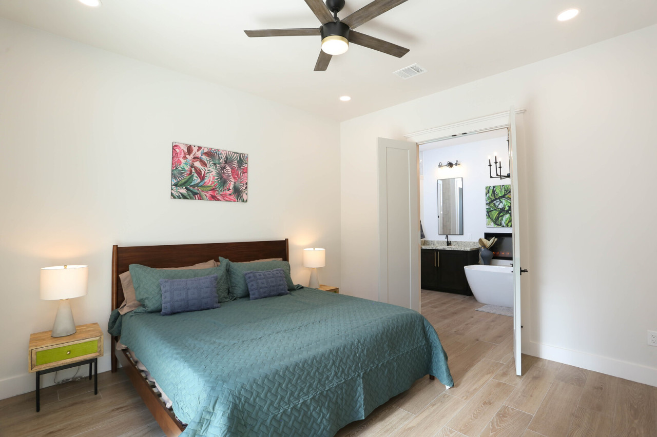 Bedroom 1: King bed with patio sliding door and attached bathroom