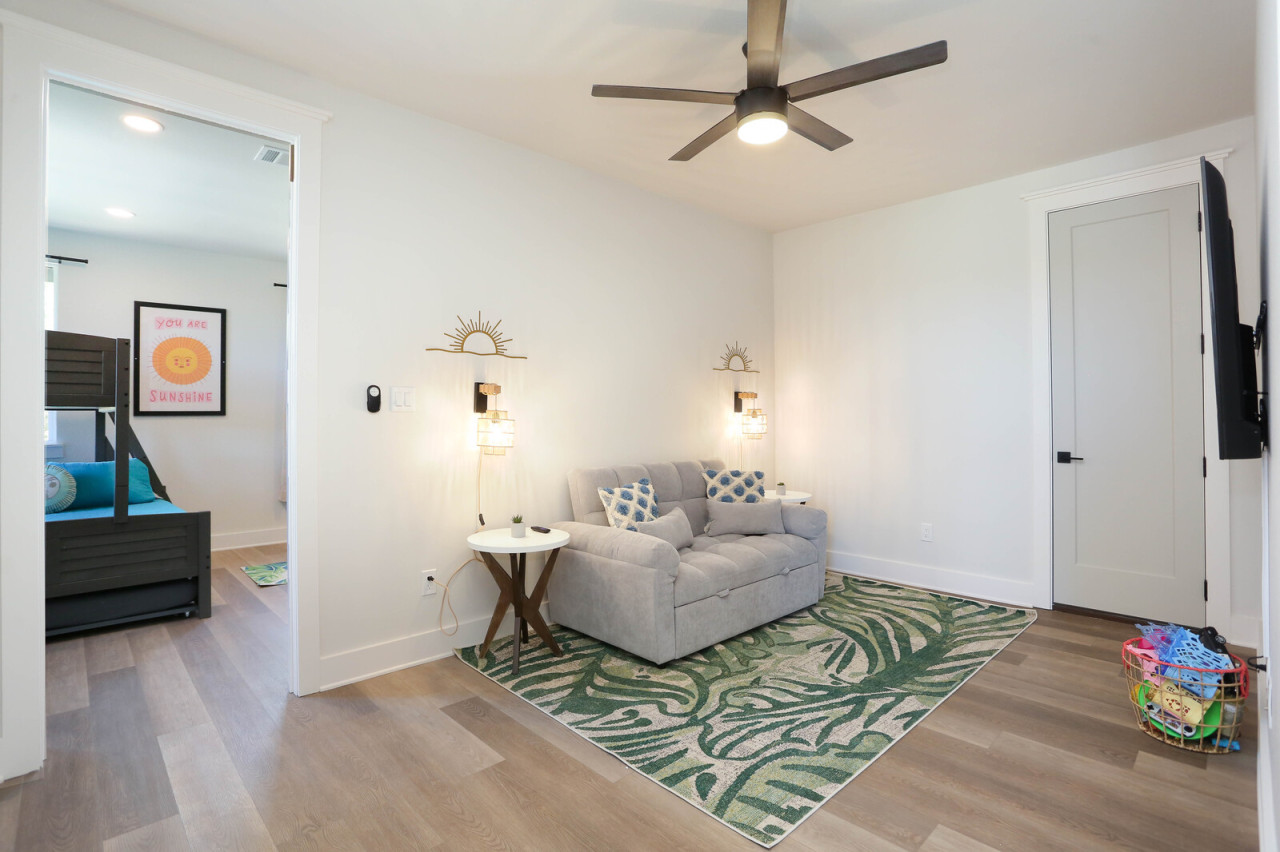 Bedroom 5: Bunk room with two bunk beds with trundles and attached bathroom