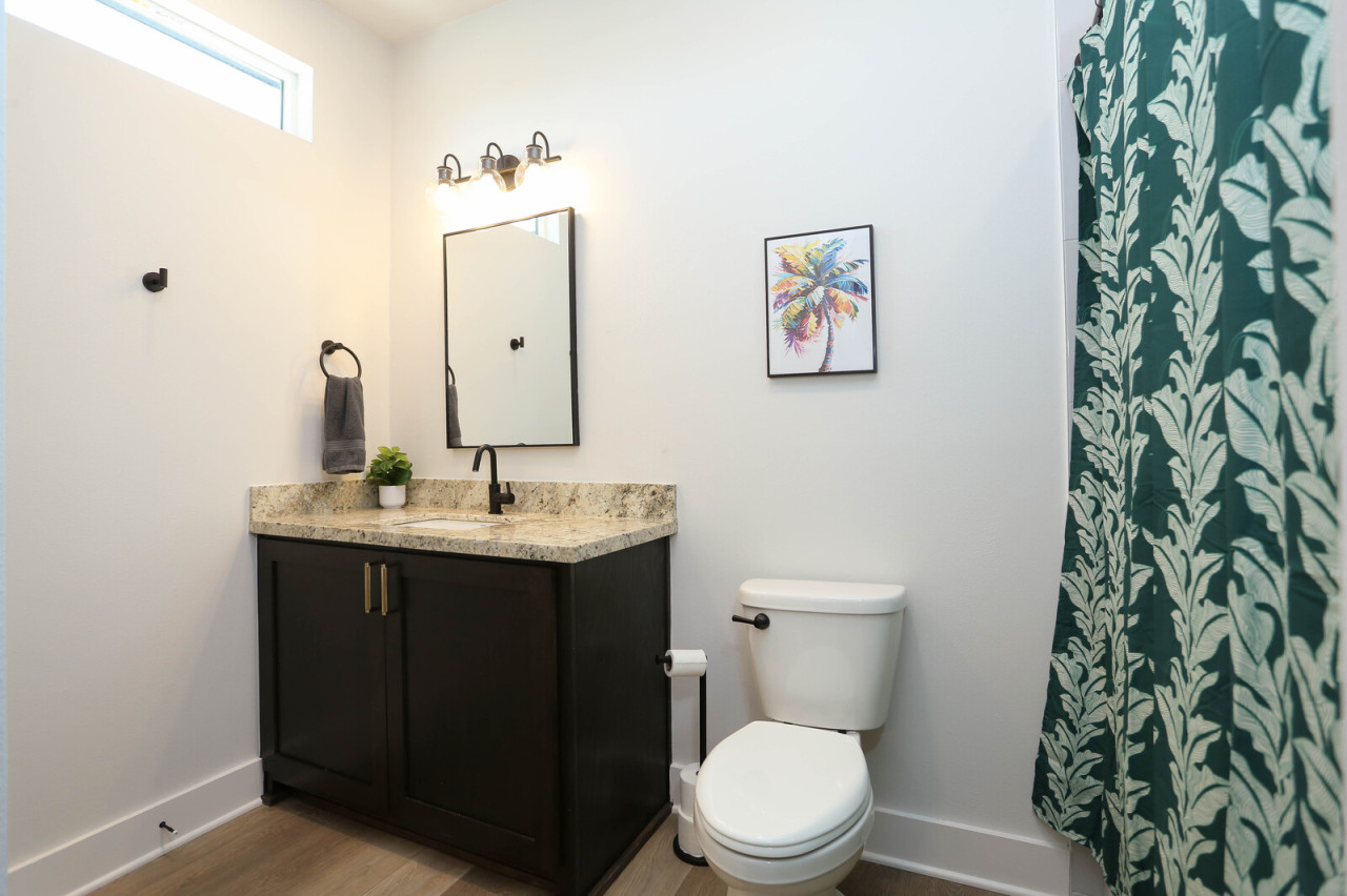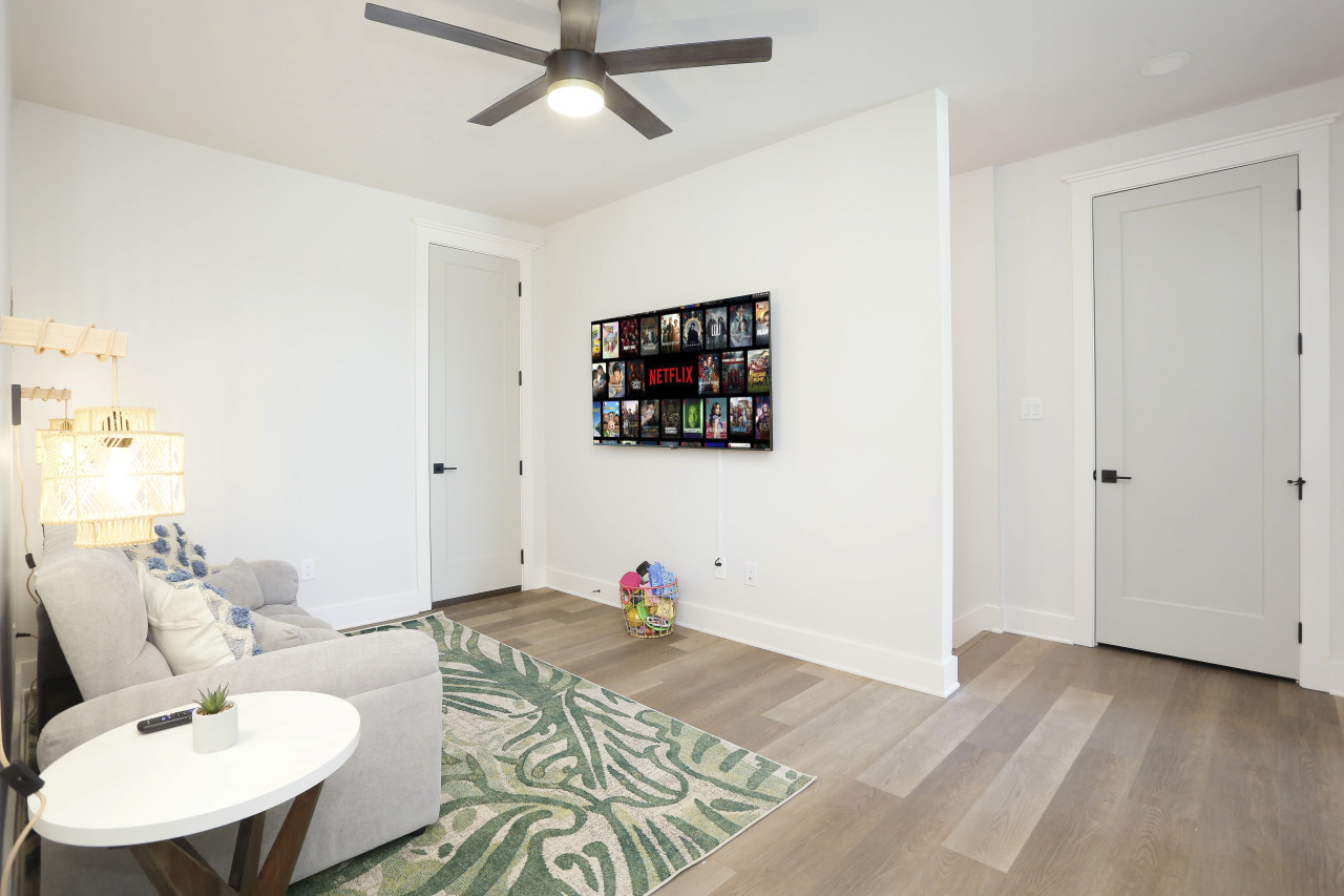 Families will love the private pool with an overflowing hot tub, the full arcade game room with a 120-inch projector TV, and outdoor activities like Connect 4, cornhole, and washers. Each bedroom features its own ensuite bathroom, ensuring comfort and privacy for everyone.
