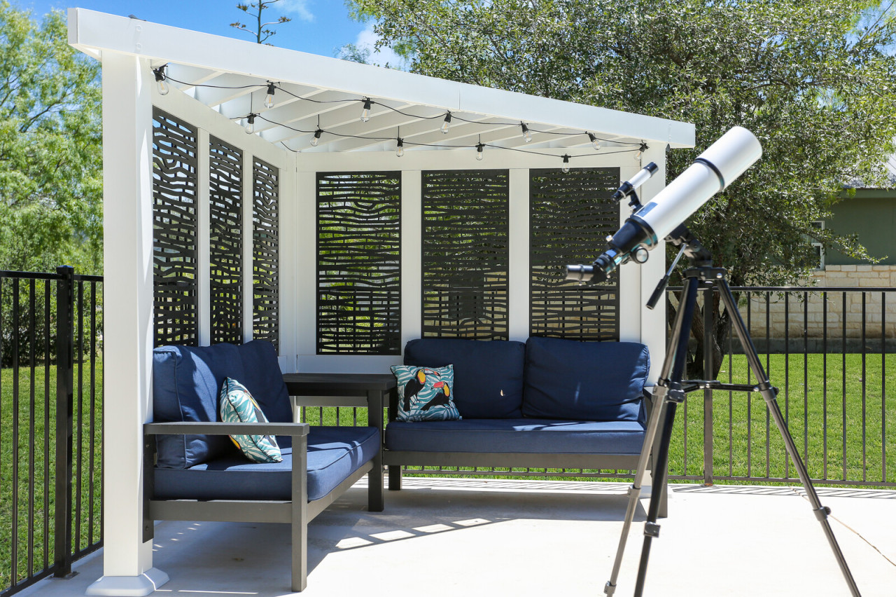 El Tropicano’s outdoor kitchen, complete with a fireplace, BBQ smoker, and an 85-inch TV, is perfect for family cookouts under the stars. Located in the heart of Concan, this vacation home is an ideal base for exploring the Frio River and the surrounding Hill Country.