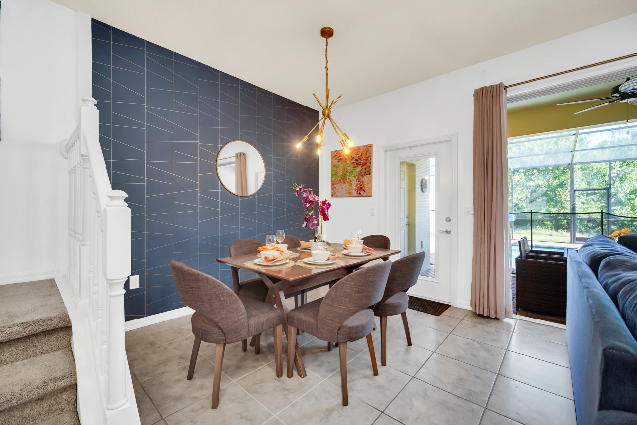 Colorful Oasis' in Kissimmee, FL – the perfect spot for your family vacation! This 5-bedroom home is like a cozy haven with special rooms for kids – one with Marvel and another with Nemo themes. The master suite is super comfy with a king bed.