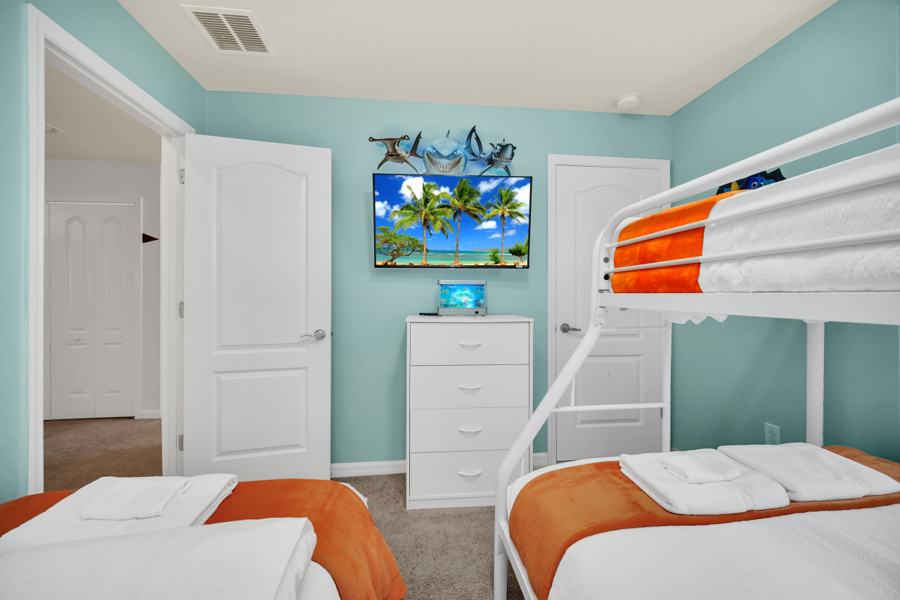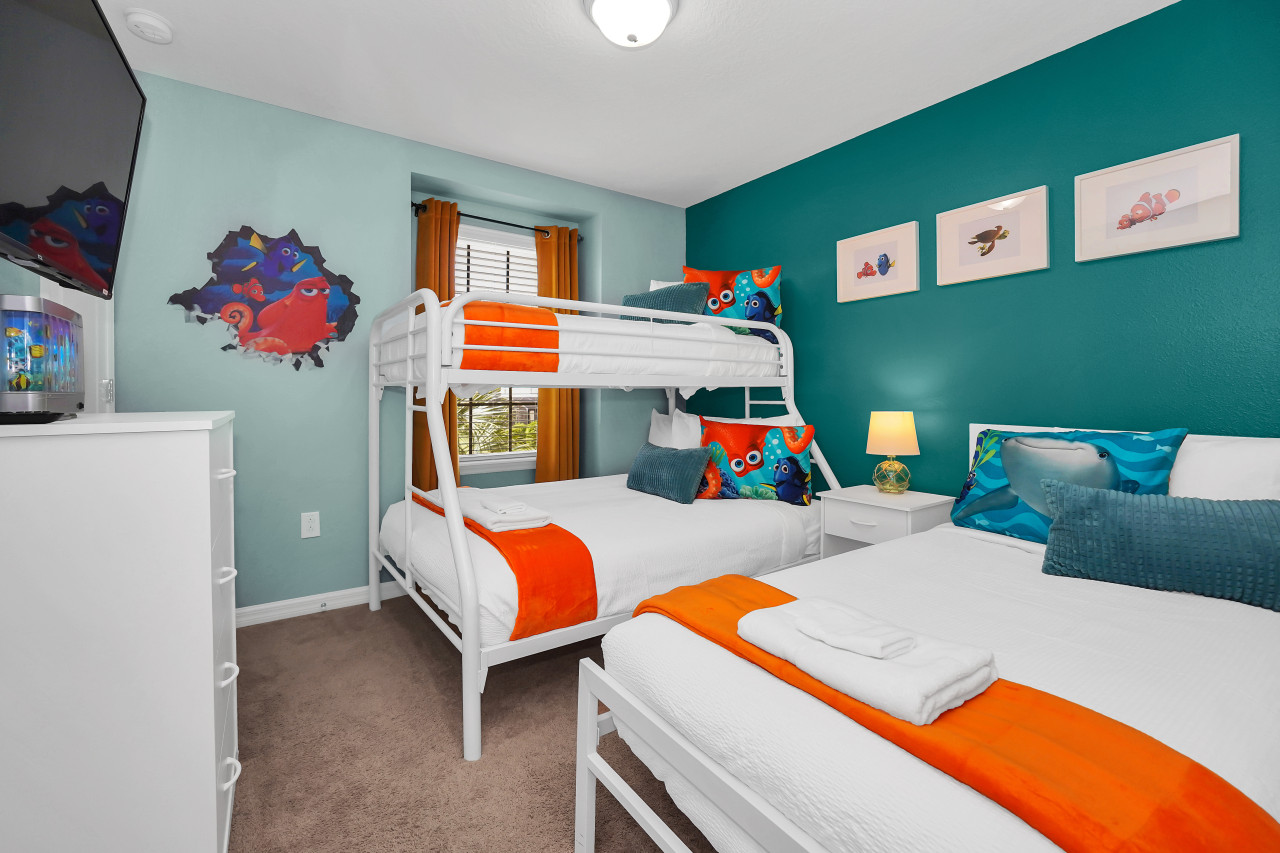 • Bedroom #5 – Nemo Themed Room: Delight in the charm of the Nemo-themed room, with a Full bed and a Twin over Full Bunk Bed, along with a large flatscreen TV.