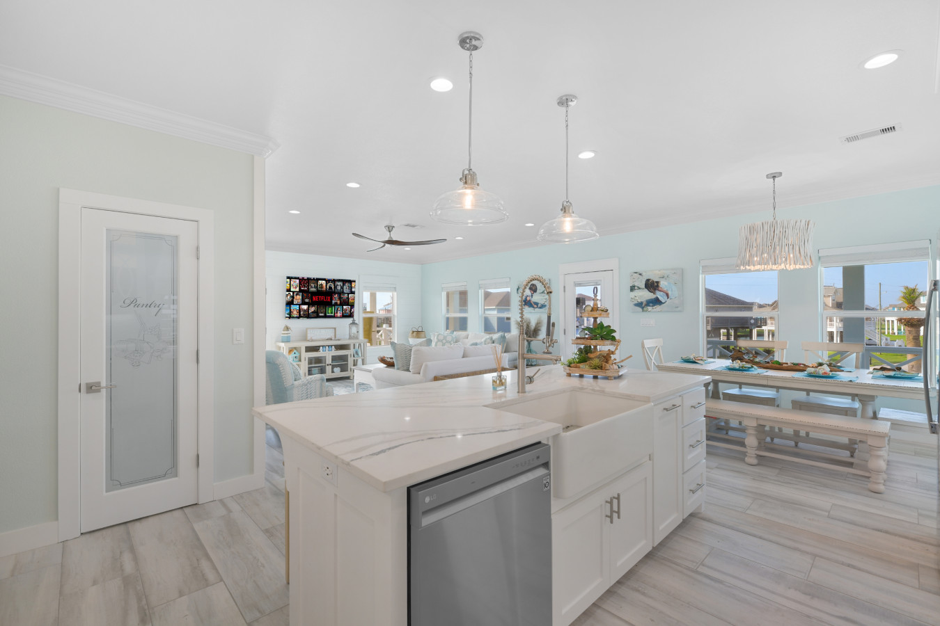 Inside, the home features a spacious open floor plan, where the living, kitchen, and dining areas flow effortlessly—perfect for large families and group gatherings. The fully equipped kitchen includes a dishwasher, microwave, and all the essentials you need to prepare meals with ease. A full-size washer and dryer make cleanup simple after a sandy beach day.