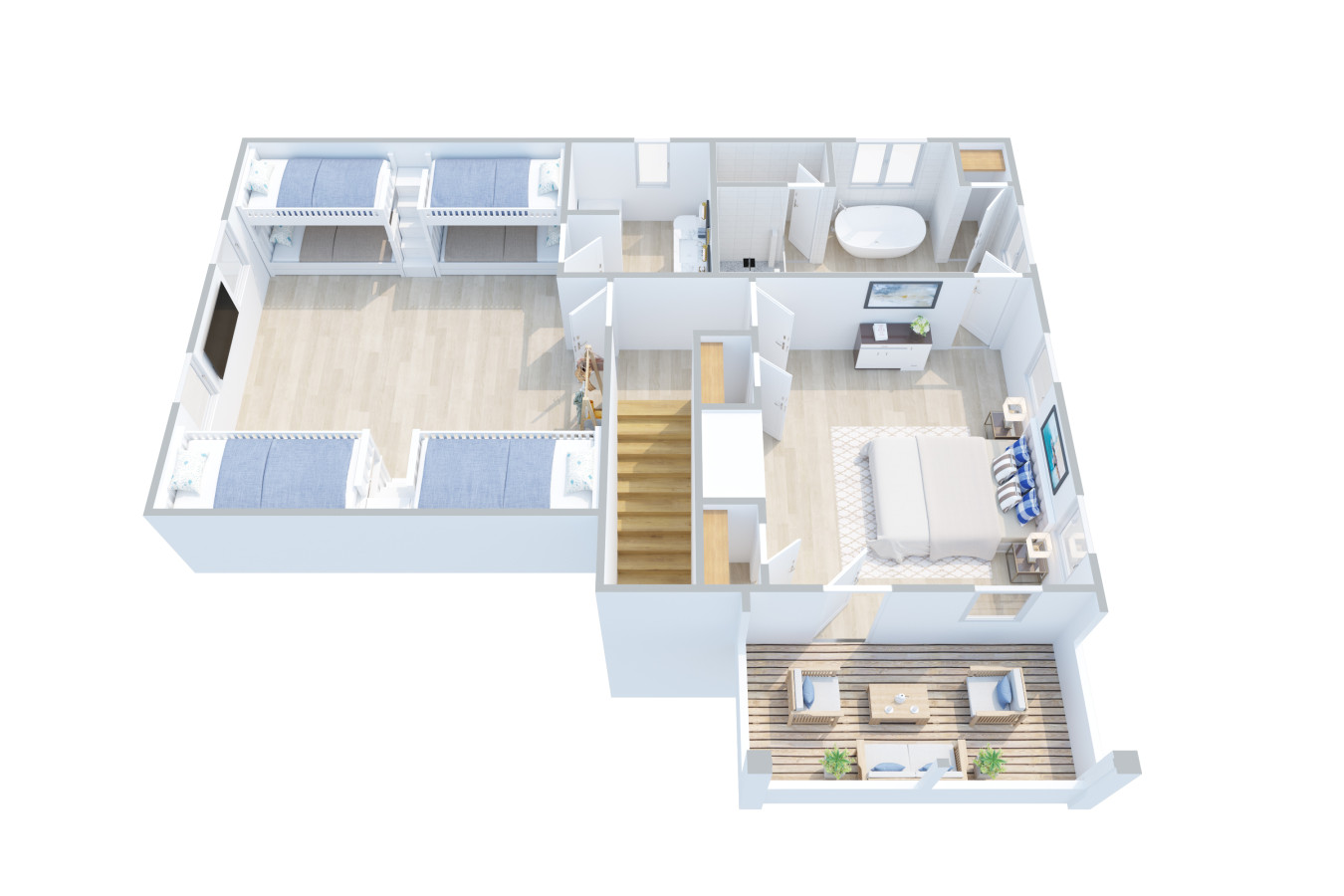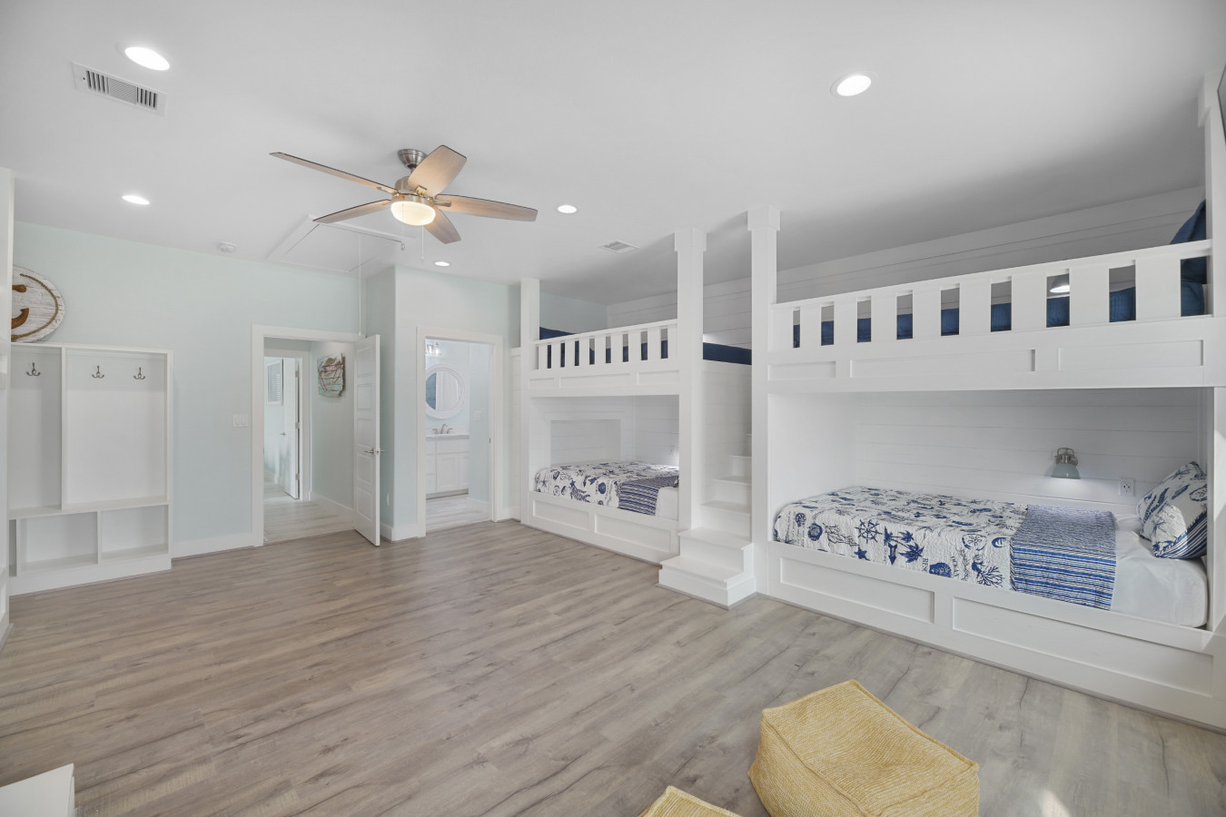 Sleeping arrangements are designed for flexibility and space: the primary suite offers a luxurious king bed and spa-style en-suite bathroom with a deep soaking tub, and oversized walk-in shower. Two additional guest rooms with queen beds provide cozy, private retreats, while a fourth bedroom offers an impressive eight queen bunk beds, ideal for kids, cousins, or the whole crew.