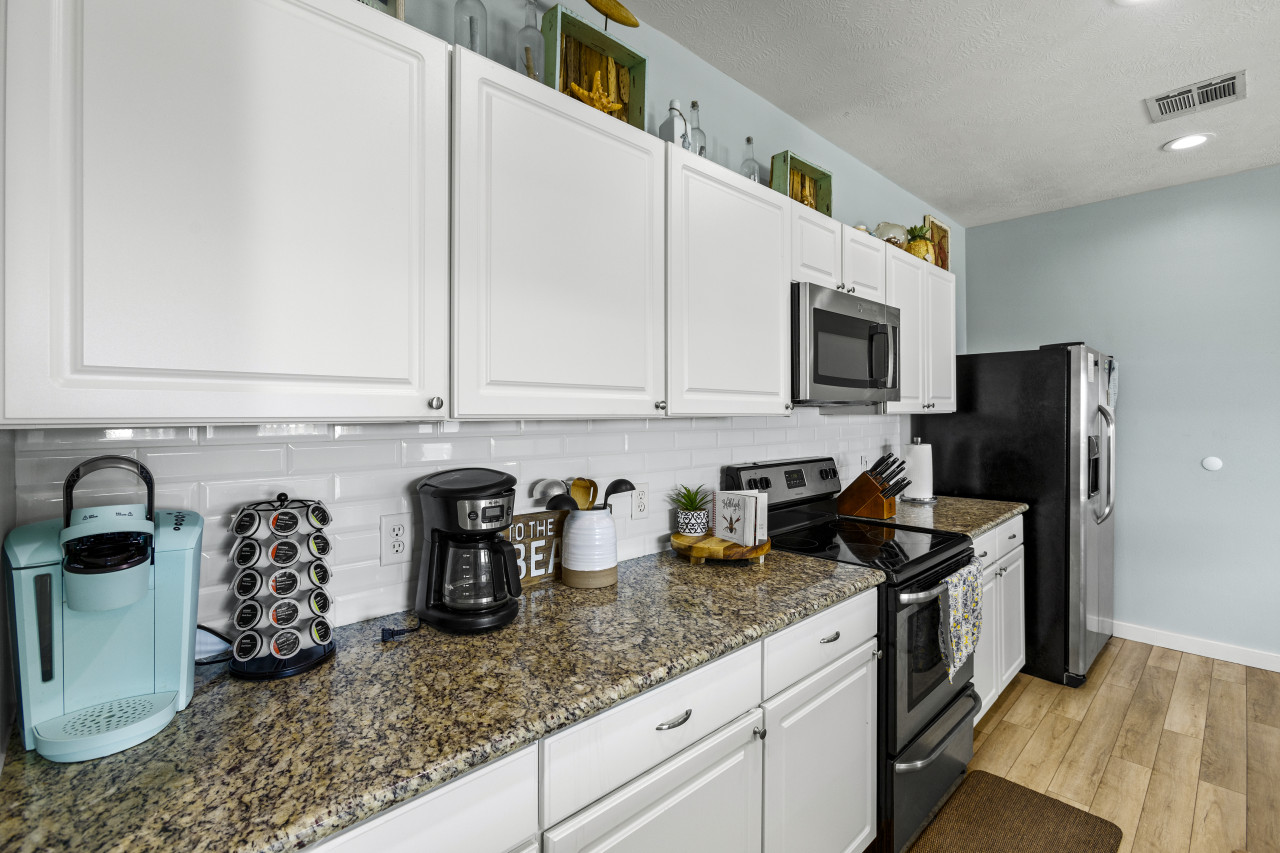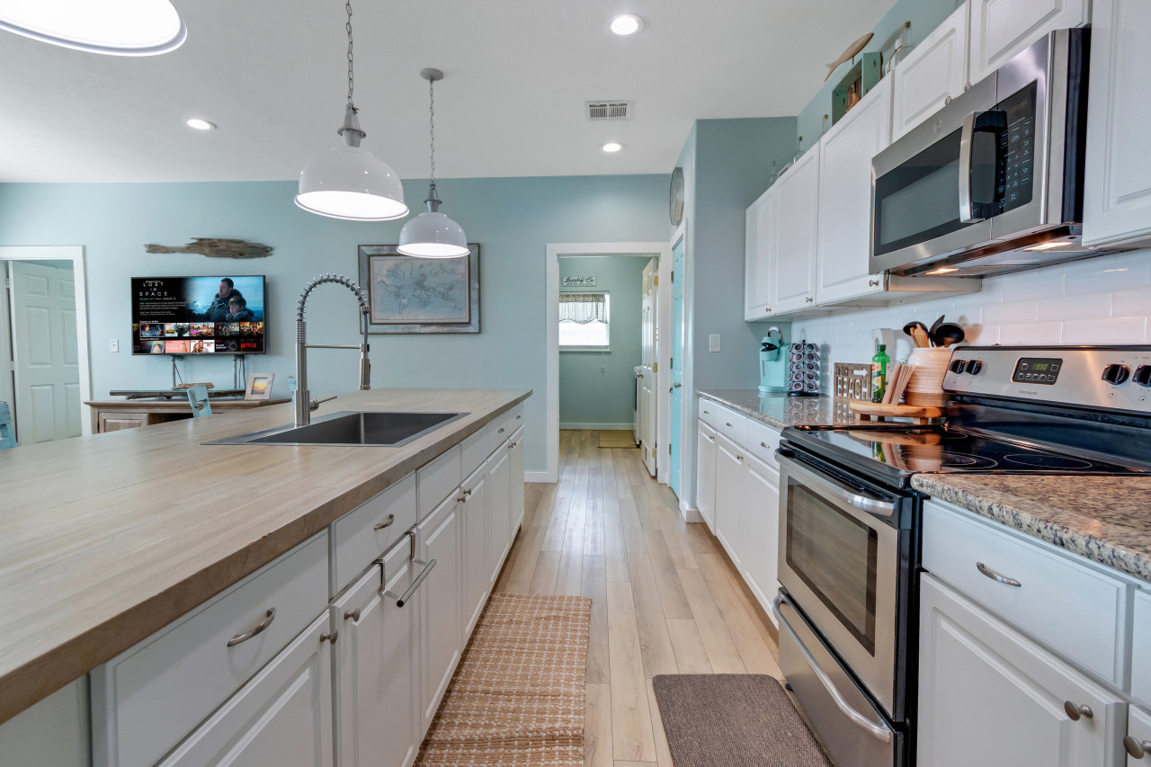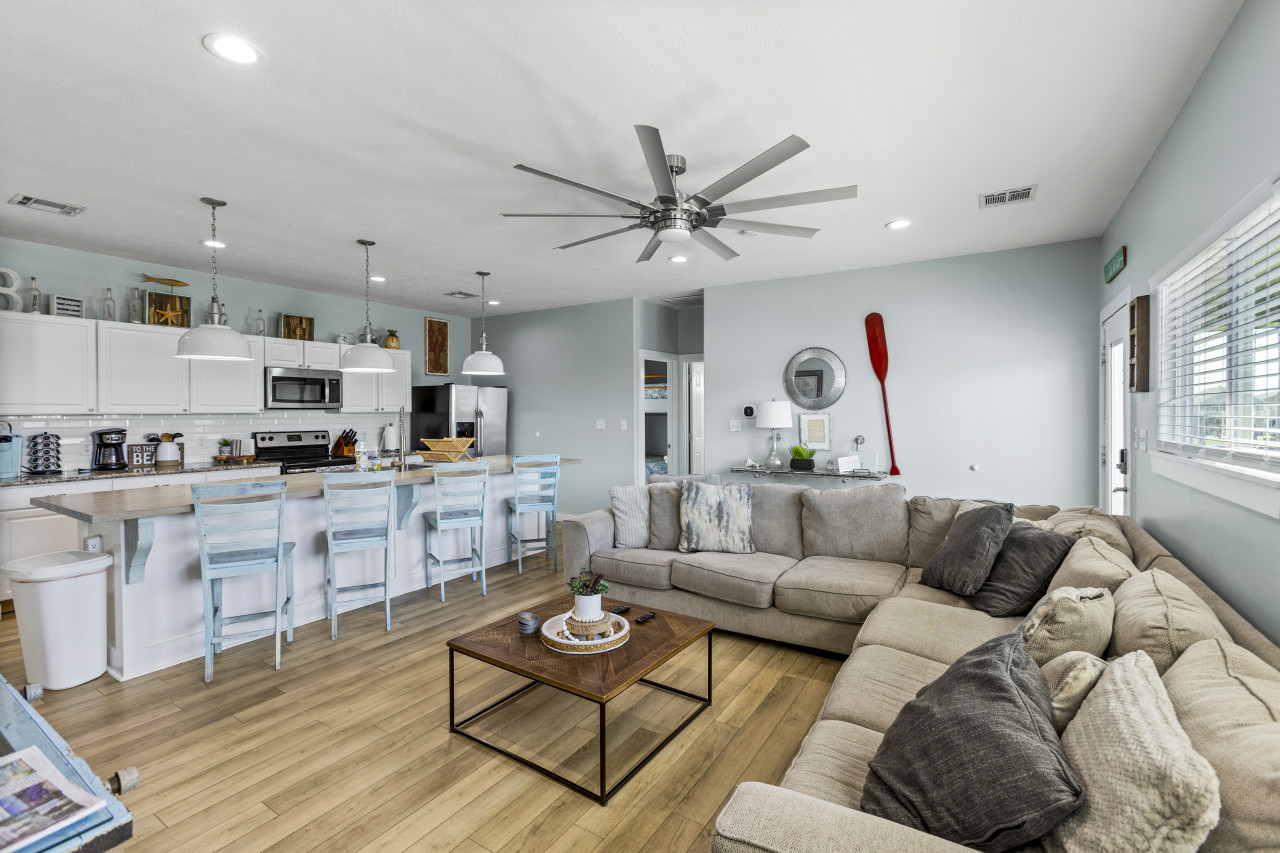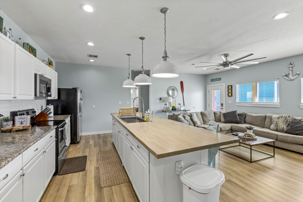 Step inside to discover a welcoming open floor plan, where the soft sea breeze mingles with the laughter of loved ones. The well-appointed kitchen, adorned with granite countertops and modern amenities, sets the stage for culinary adventures and memorable family meals. After a day of beachcombing and seaside fun, rinse off the salty sea water in the outdoor shower before gathering around the fire pit for s'mores under the stars, creating unforgettable moments that will be cherished for years to come.