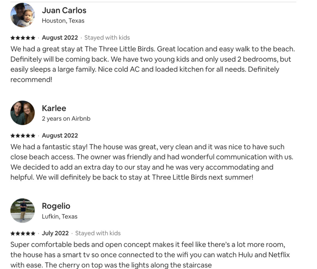 We had an amazing stay at Three Little Birds this past weekend! The beach house was perfect for our end-of-summer family vacation. Located in Crystal Beach, it was just a short walk to the sand and waves, yet peaceful and quiet—exactly what we needed to relax and unwind. The home itself was clean, cozy, and had a very welcoming, homey feel. You can tell Derek and Lauren, the hosts, have put a lot of care into making this a special place. It’s also conveniently located—not far from Galveston, which made for an easy day trip. Thank you, Derek and Lauren, for sharing your beautiful beach house with us. We’ll definitely be back!