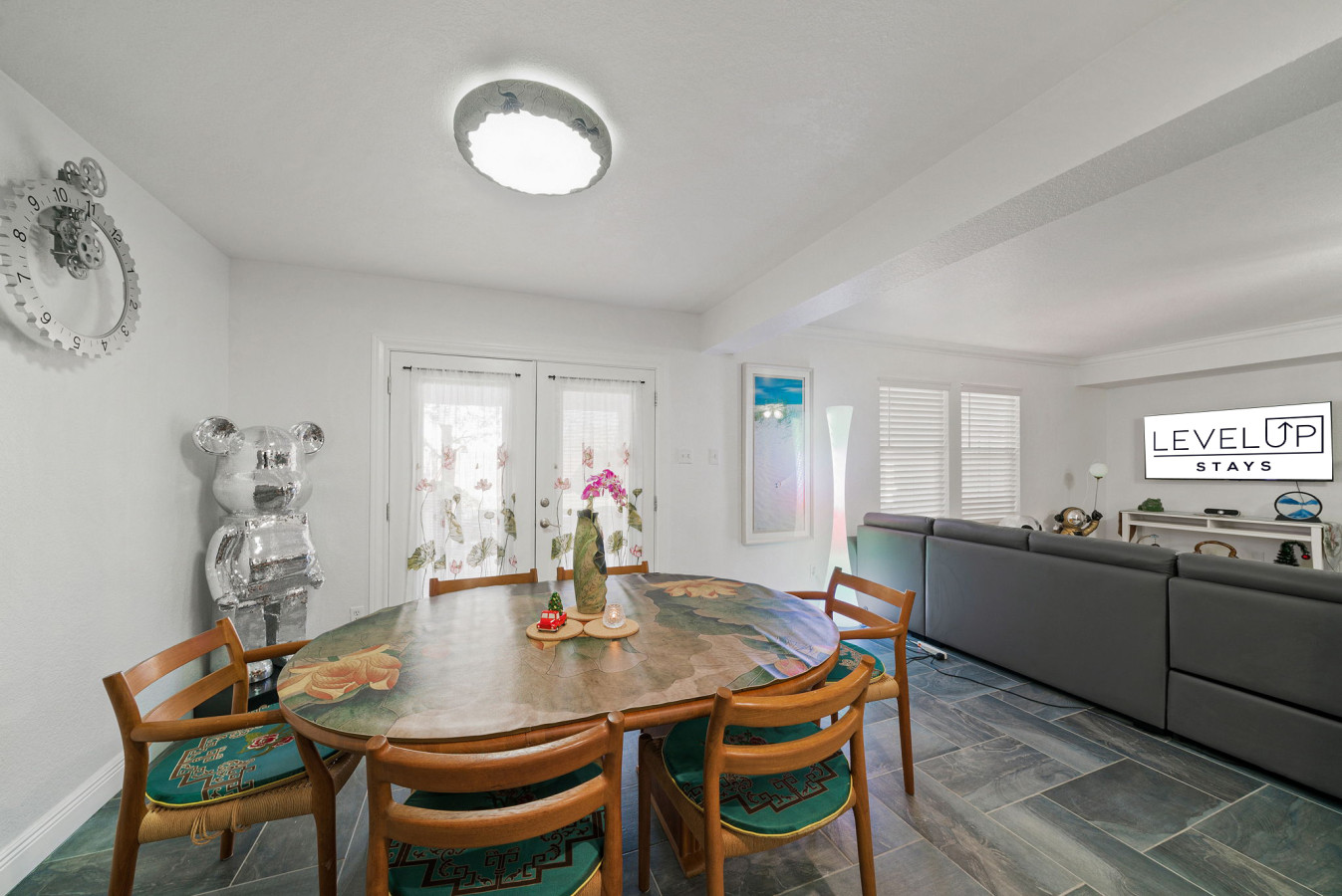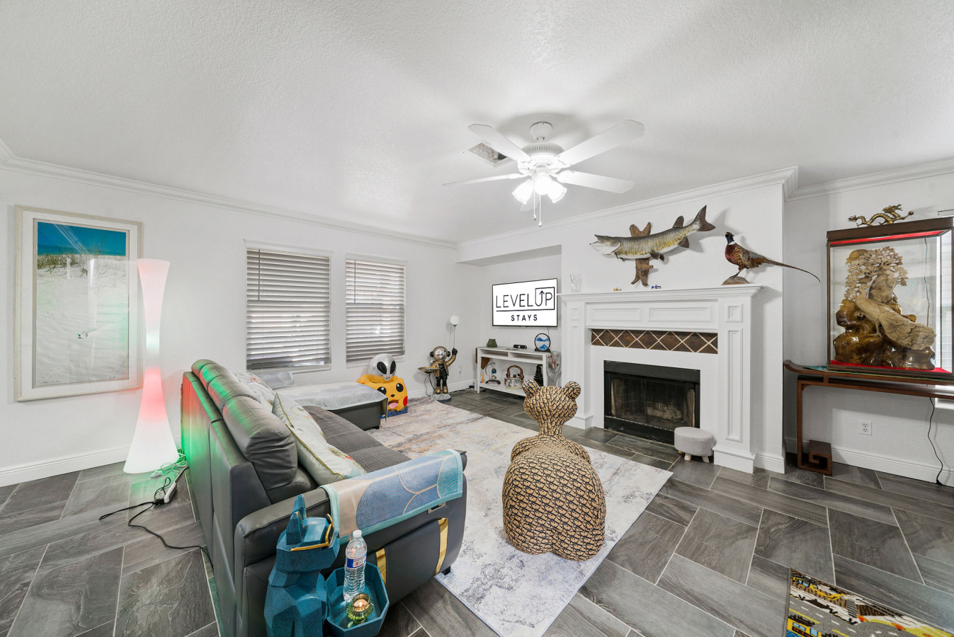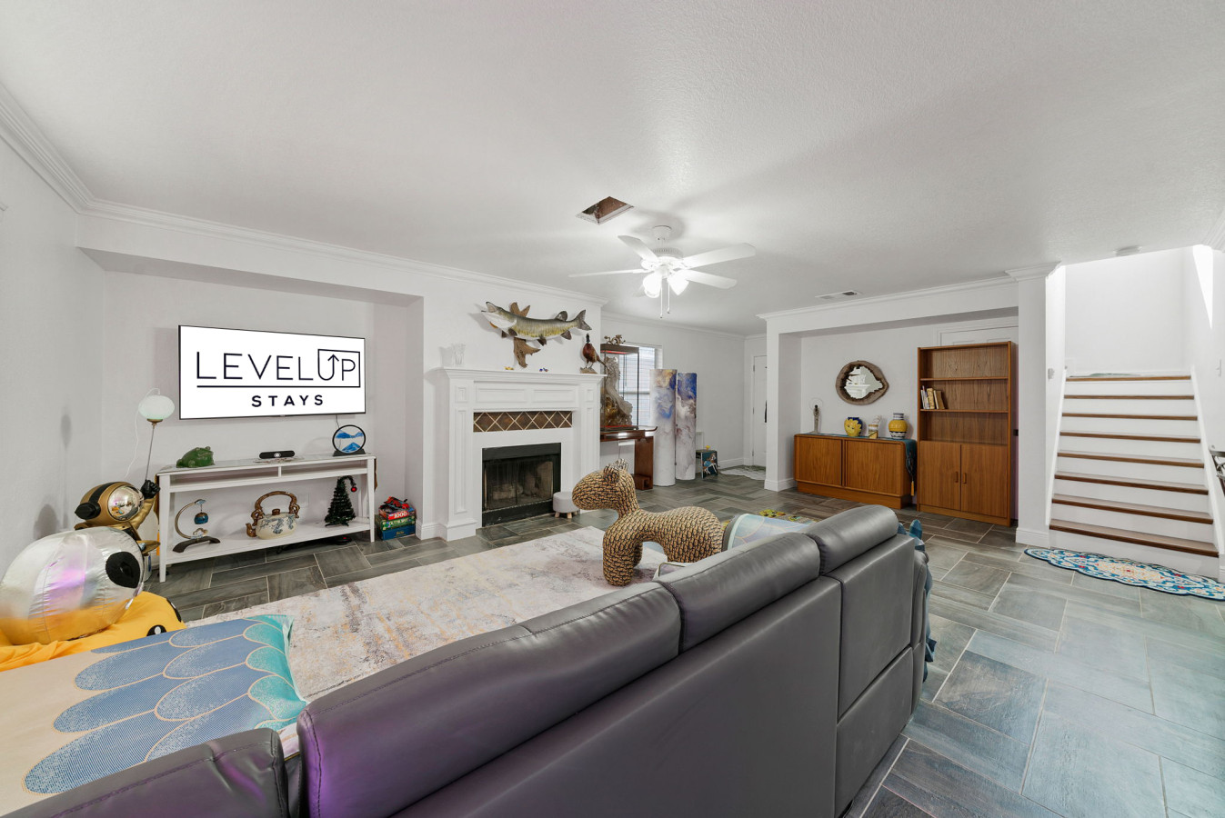 Step inside Cosmic Retreat to find a warm, inviting first floor with an open-concept living, dining, and kitchen space designed for family connection. The fully stocked modern kitchen is perfect for whipping up breakfast before exploring or winding down with dinner after a day out. Upstairs, the kids will love their themed bedrooms—one a pink princess dream, the other a space-inspired astronaut room—each with bathroom access. Two queen bedrooms feature soft bedding and chic, cozy décor for restful nights.