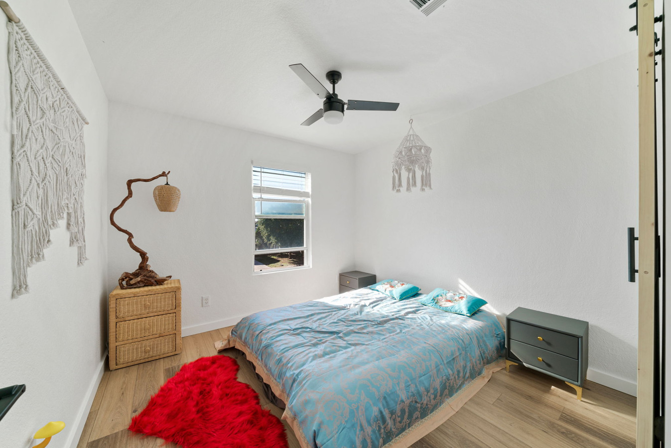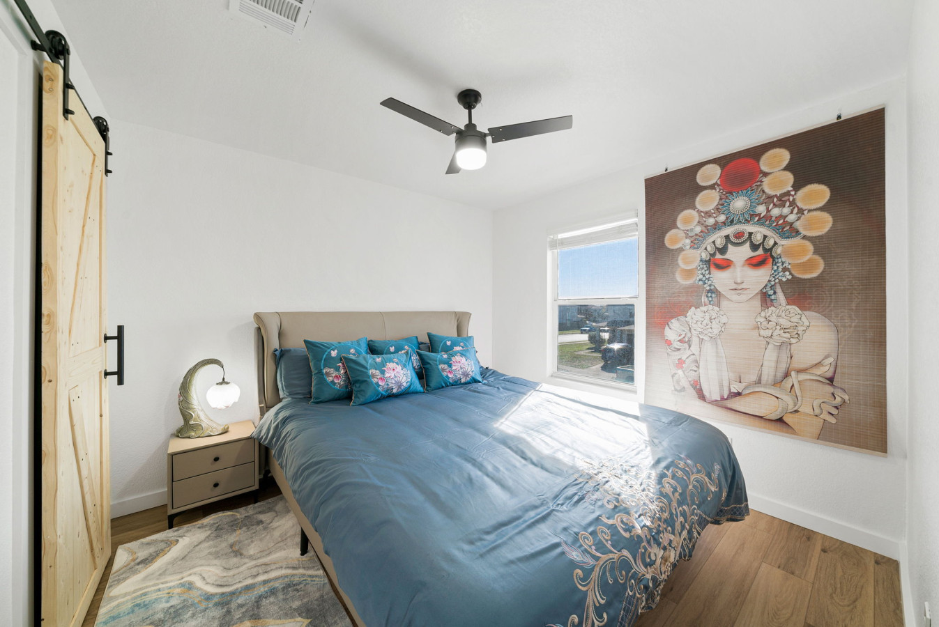 • Primary Bedroom: bright and airy with a queen bed, modern décor, and relaxing vibe after a busy day.