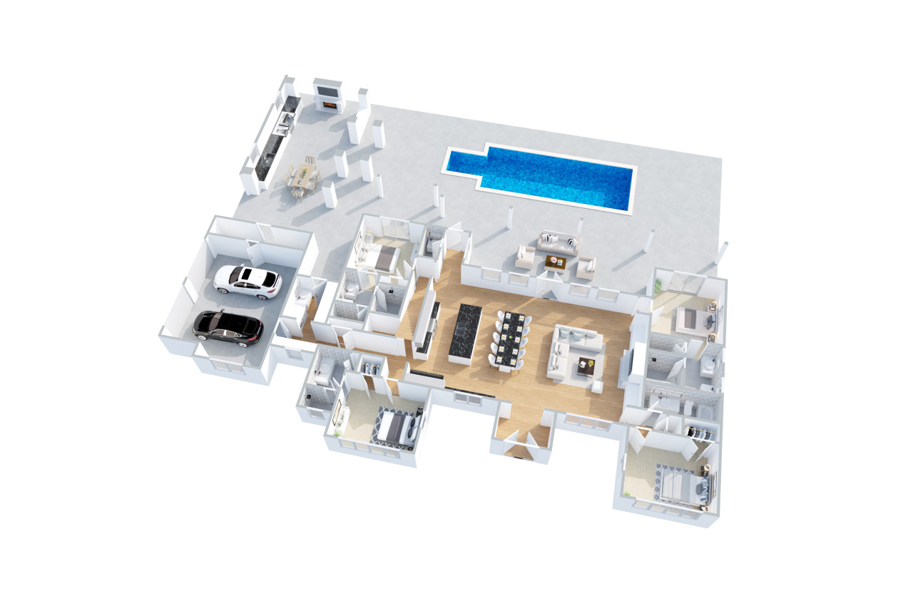 • Large outdoor kitchen features fridge, TV, and fireplace.